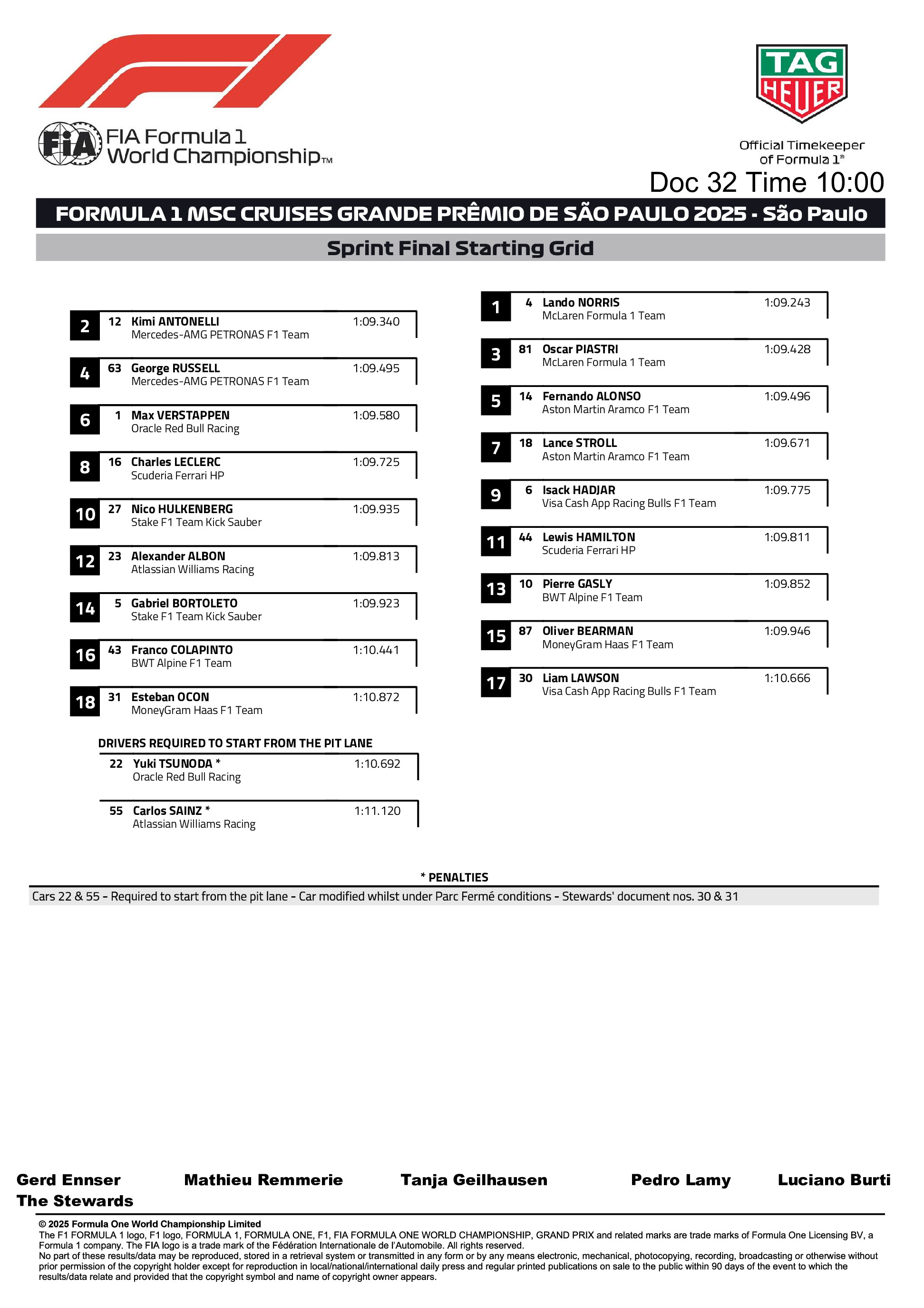Grand Prix du Brésil 2025 : grille de départ définitive du Sprint