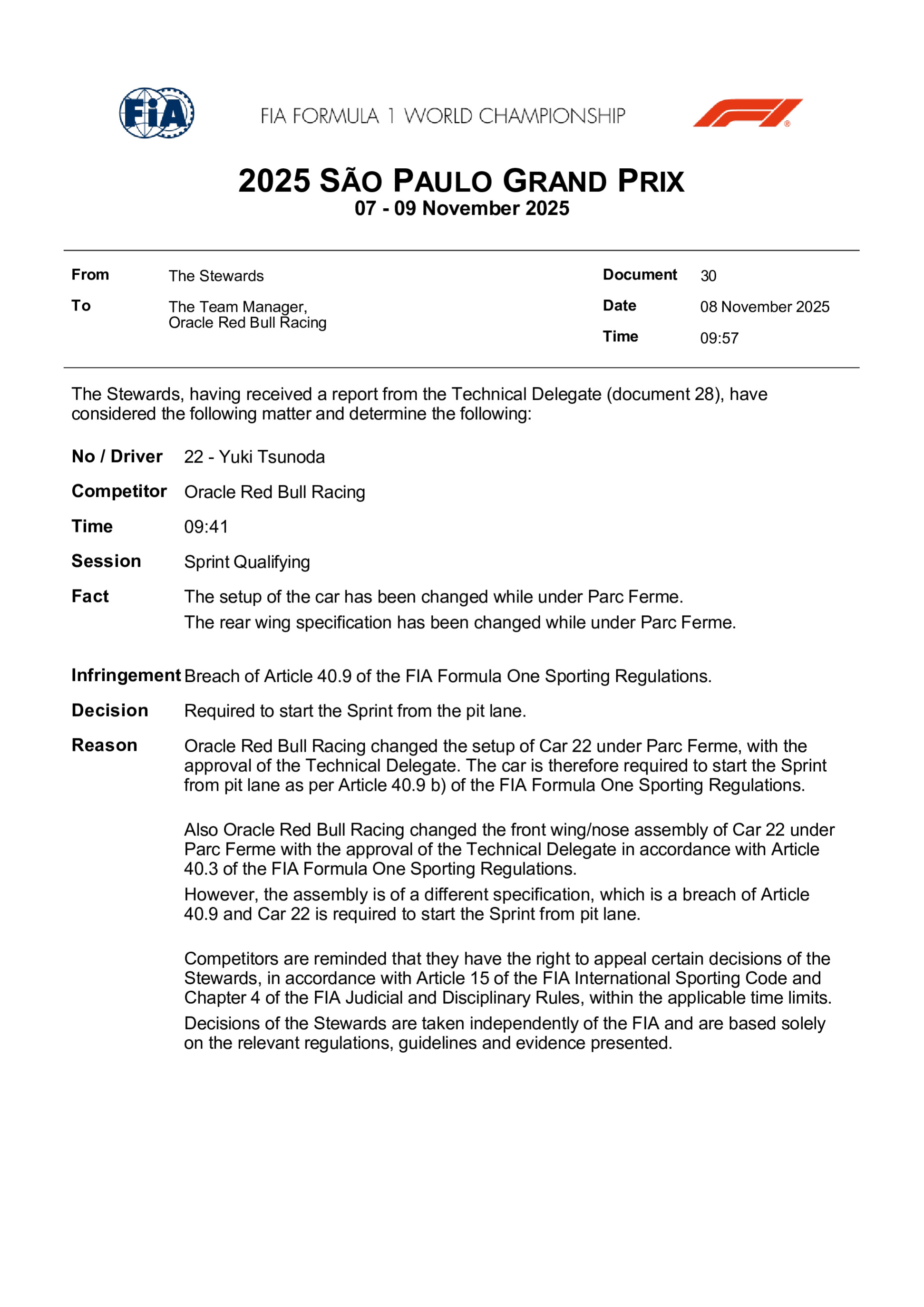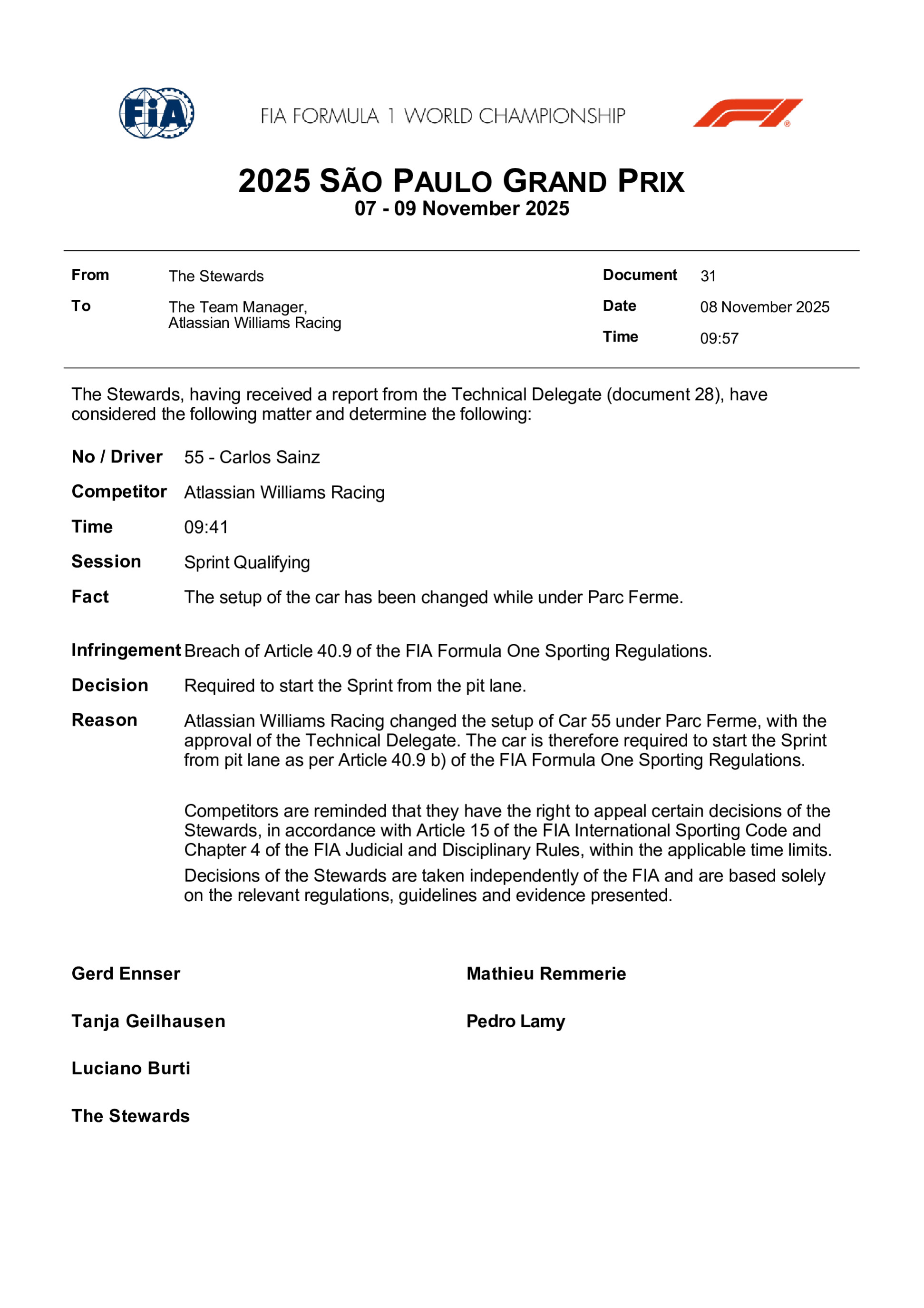 En revanche, Yuki Tsunoda (Red Bull) et Carlos Sainz (Williams) prendront le départ depuis la voie des stands. Les commissaires ont confirmé que leurs équipes avaient modifié les réglages de leurs monoplaces sous régime de parc fermé, en infraction avec l'article 40.9 b) du Règlement Sportif de la FIA.