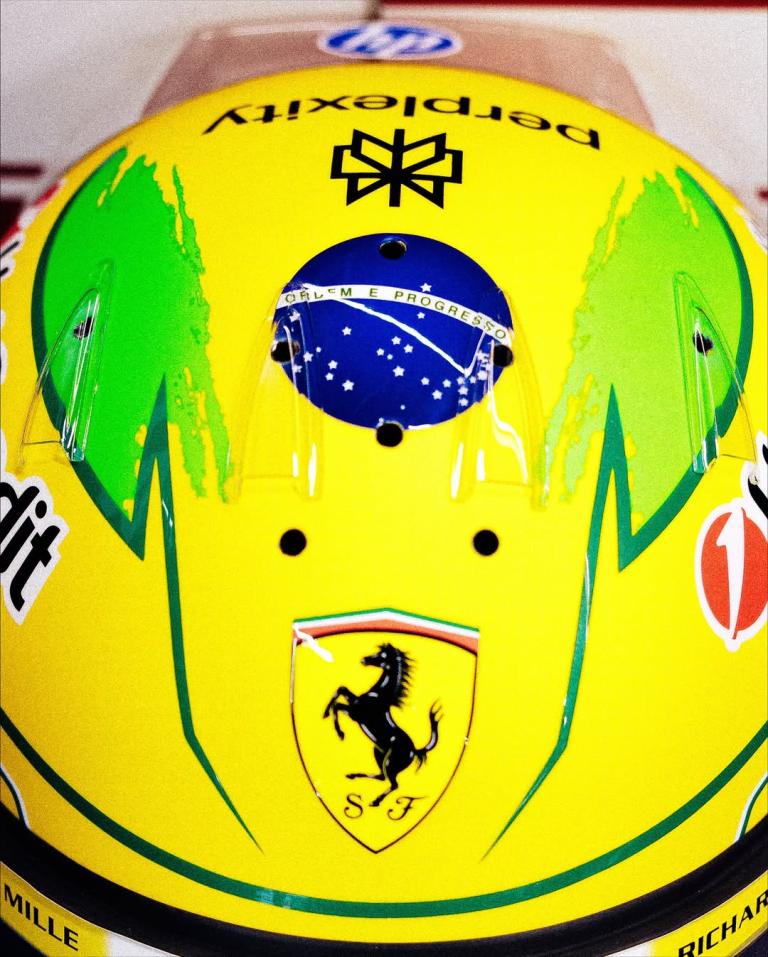 Son casque, aux tons or, vert et bleu, rend hommage à son Brésil natal avec des détails évoquant la famille, la foi et la nature.