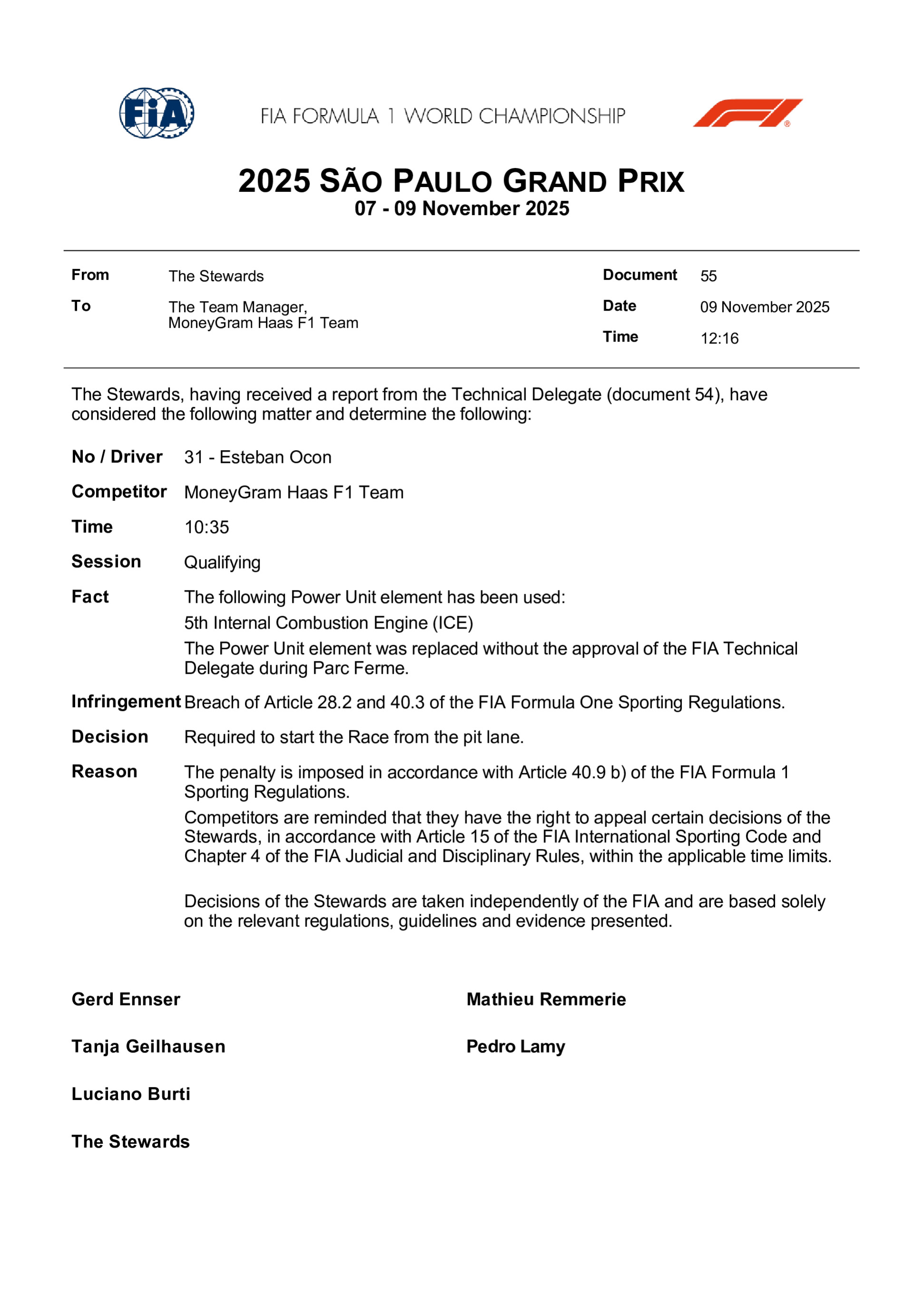Le Grand Prix du Brésil 2025 comptera 18 voitures sur la grille. Max Verstappen et Esteban Ocon s'élanceront depuis la voie des stands après des changements d'éléments moteur effectués sous régime de Parc Fermé, en infraction avec le règlement.