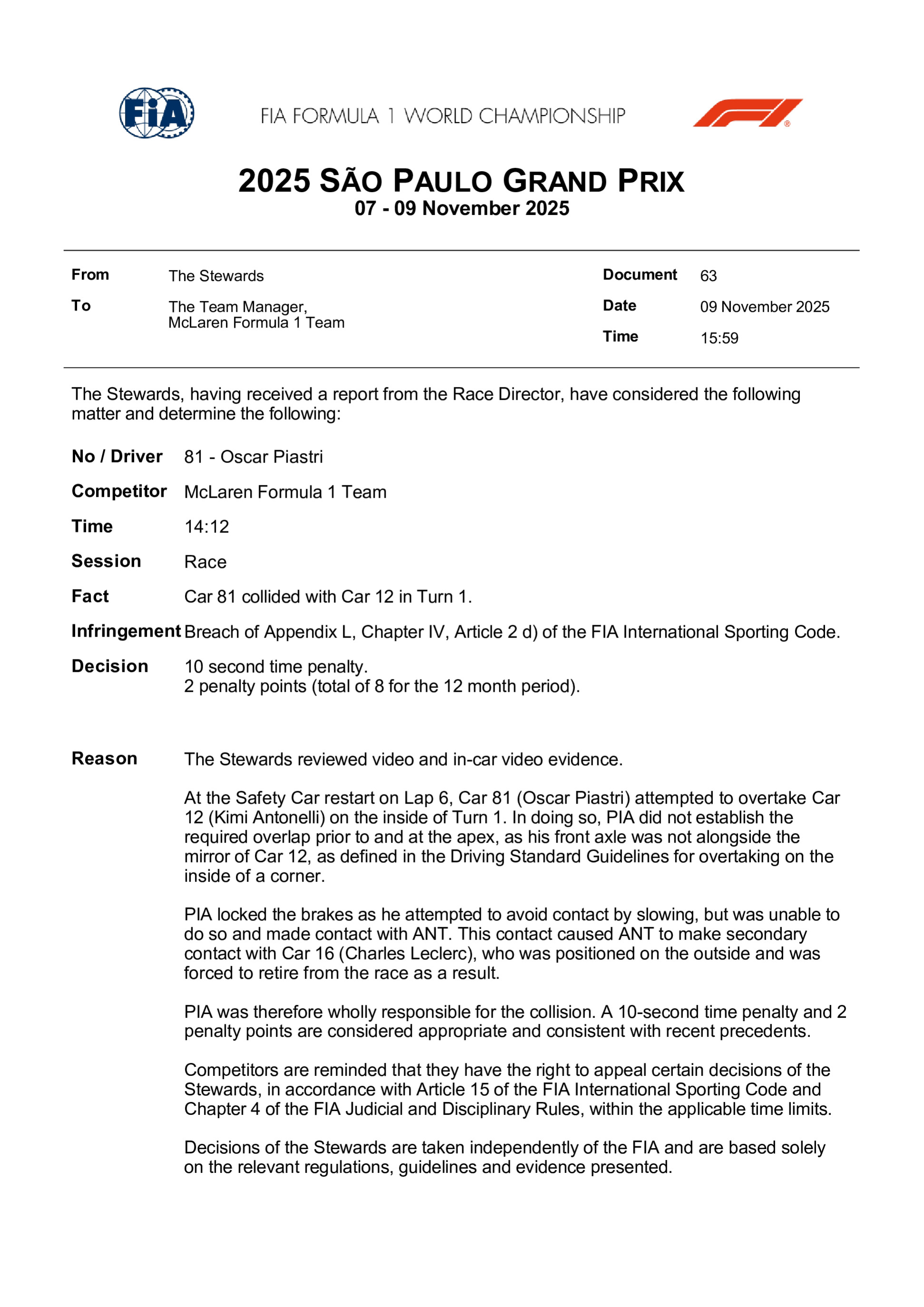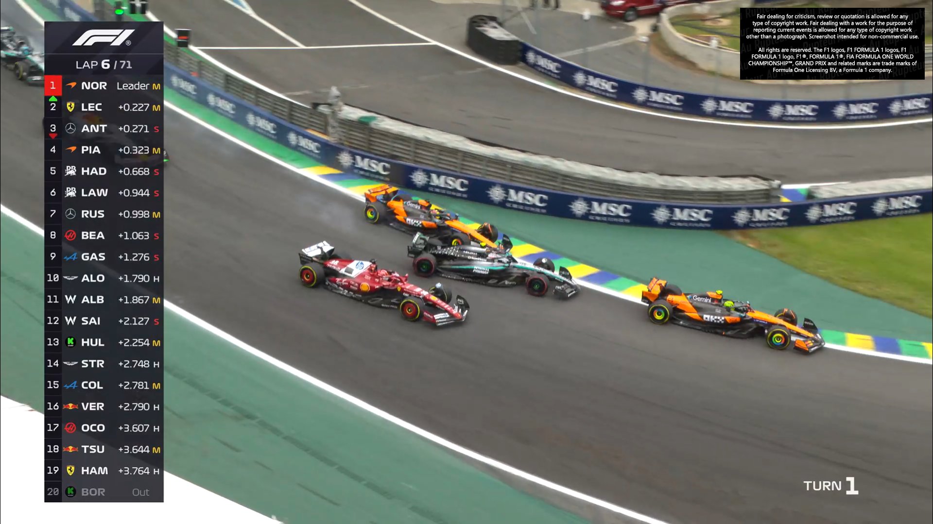 Cinquième à l'arrivée du Grand Prix du Brésil, Oscar Piastri a dû composer avec une pénalité de dix secondes pour son accrochage avec Kimi Antonelli, incident qui a également provoqué l'abandon de Charles Leclerc (qui n'accuse pas Piastri…