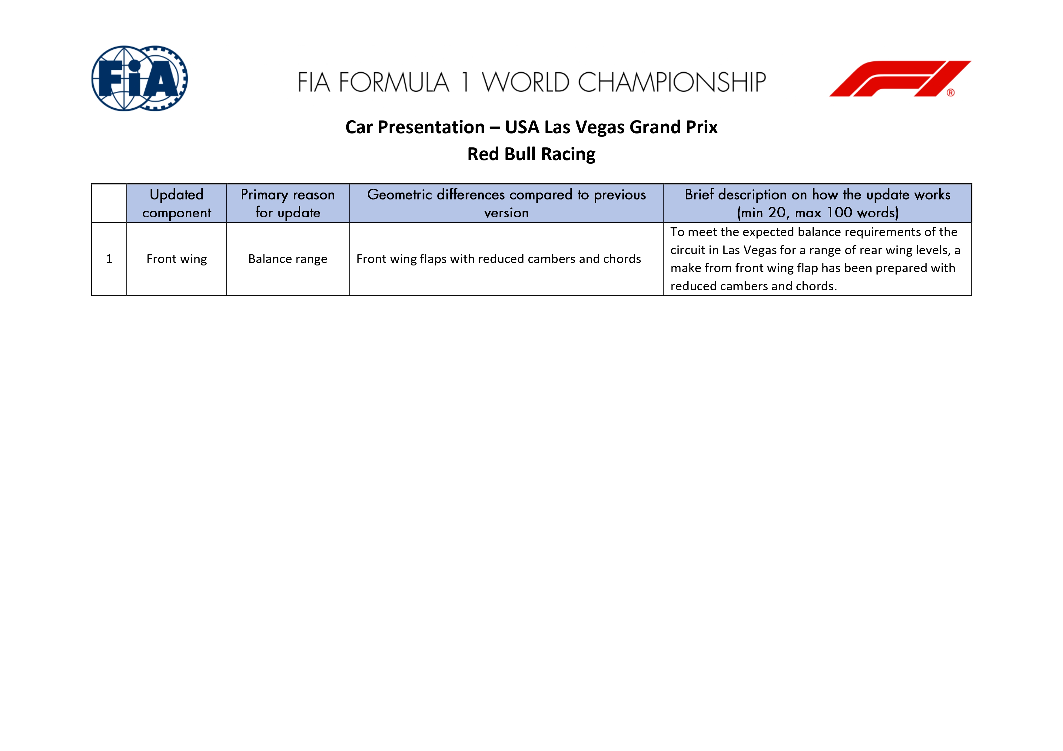 Pour Las Vegas, Red Bull introduit une évolution limitée au volet d'aileron avant, conçue pour ajuster la plage d'équilibre de la RB21 dans un contexte de niveaux d'appui arrière très variés selon les configurations retenues pour le week-end. L'équipe a préparé un flap avant dont les cambrures (cambrage) et les cordes sont réduites, une approche qui s'inscrit dans la logique d'un circuit où la vitesse de pointe impose un aileron arrière peu chargé.