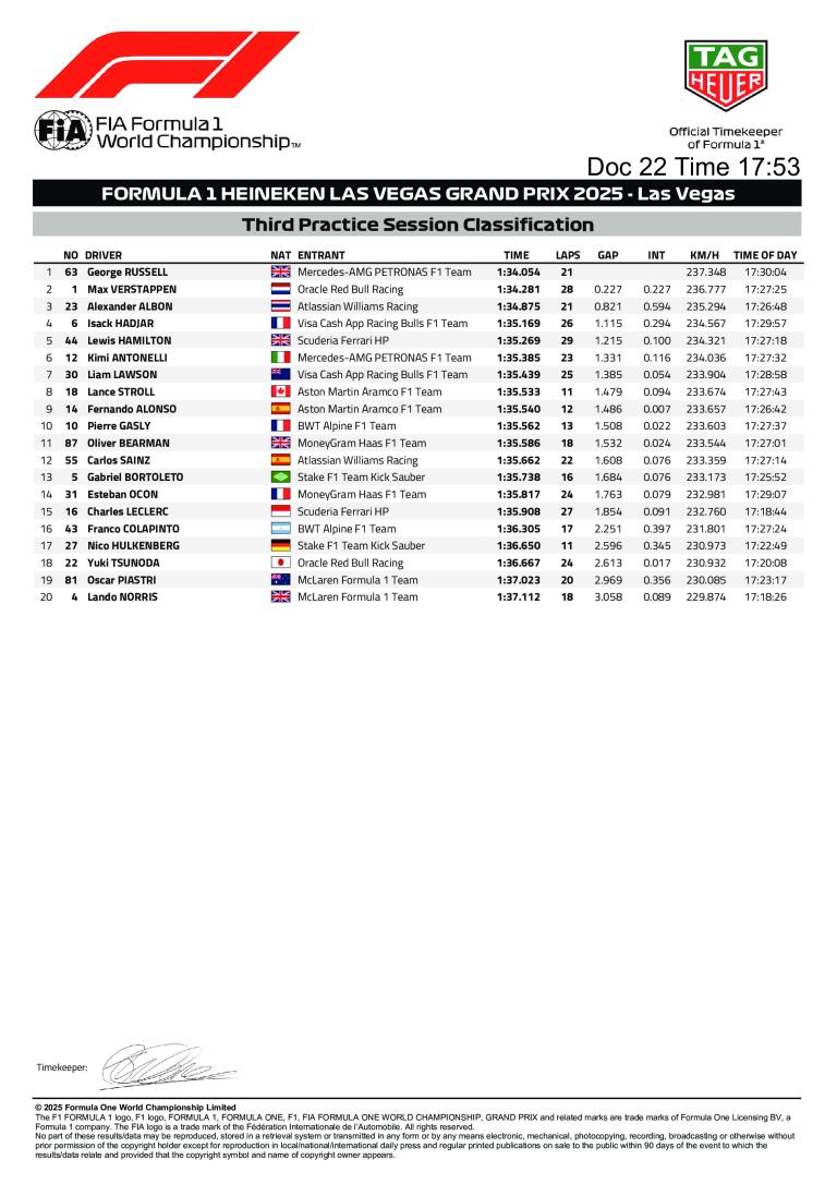 George Russell a signé le meilleur temps de la troisième séance d'essais libres du Grand Prix de Las Vegas 2025, dans une heure marquée par des conditions mixtes et un grip évolutif. Avec un 1:34.054, le Britannique devance Max Verstappen de 0"227 et Alex Albon de 0"821, au terme d'un final animé où la piste s'est nettement améliorée. À l'inverse, les deux McLaren se retrouvent au fond du classement, incapables de boucler un tour représentatif en fin de séance.