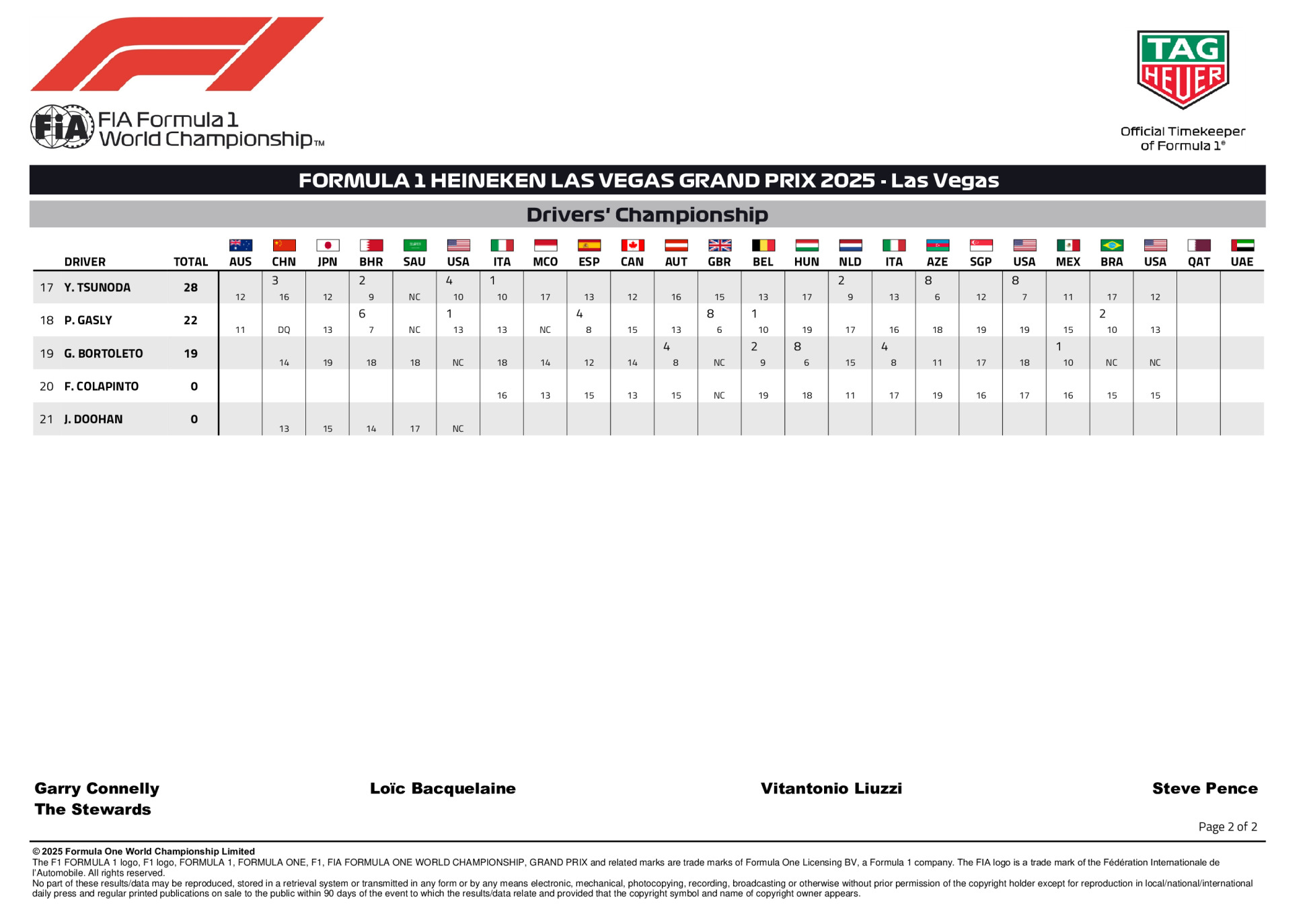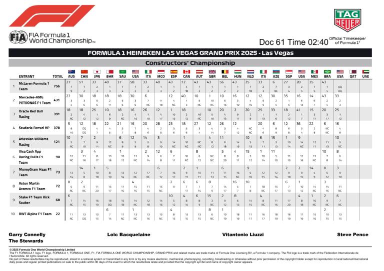 La grille de départ définitive du Grand Prix de Las Vegas 2025 a été publiée par la FIA, avec Tsunoda partant des stands.