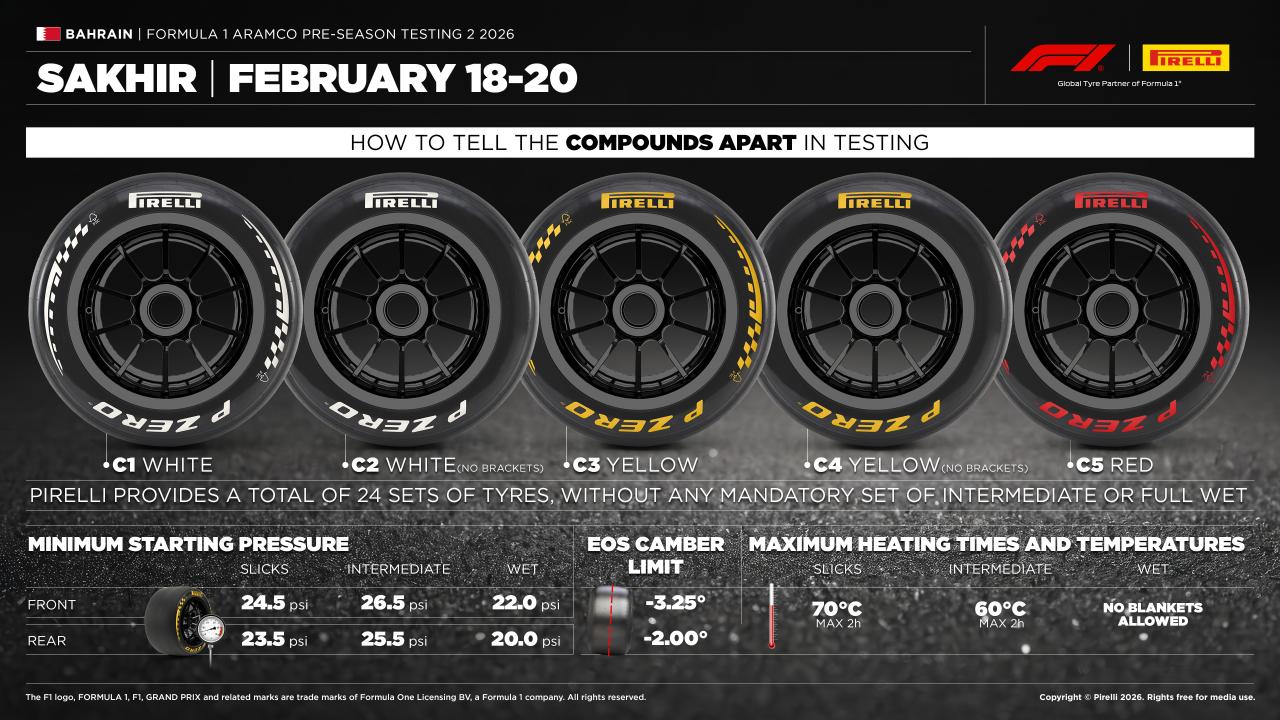 Comme lors de la première semaine, un marquage spécifique est utilisé pour distinguer les pneus en piste durant ces essais. Les C1 et C2 portent des logos blancs, les C3 et C4 des logos jaunes, et le C5 des logos rouges. Lorsque deux composés partagent la même couleur, le plus dur des deux est reconnaissable grâce à un motif en damier sur le flanc : seuls les C2 et C4 en sont dépourvus et n'arborent que les logos Pirelli et P Zero. Ce code visuel, propre aux tests, permet de suivre plus facilement les programmes de travail des équipes, qui devraient désormais combiner poursuite des simulations de course et premières recherches de performance, dans la continuité des enseignements tirés de la première semaine dominée par l'exploitation des C1, C2 et surtout C3.