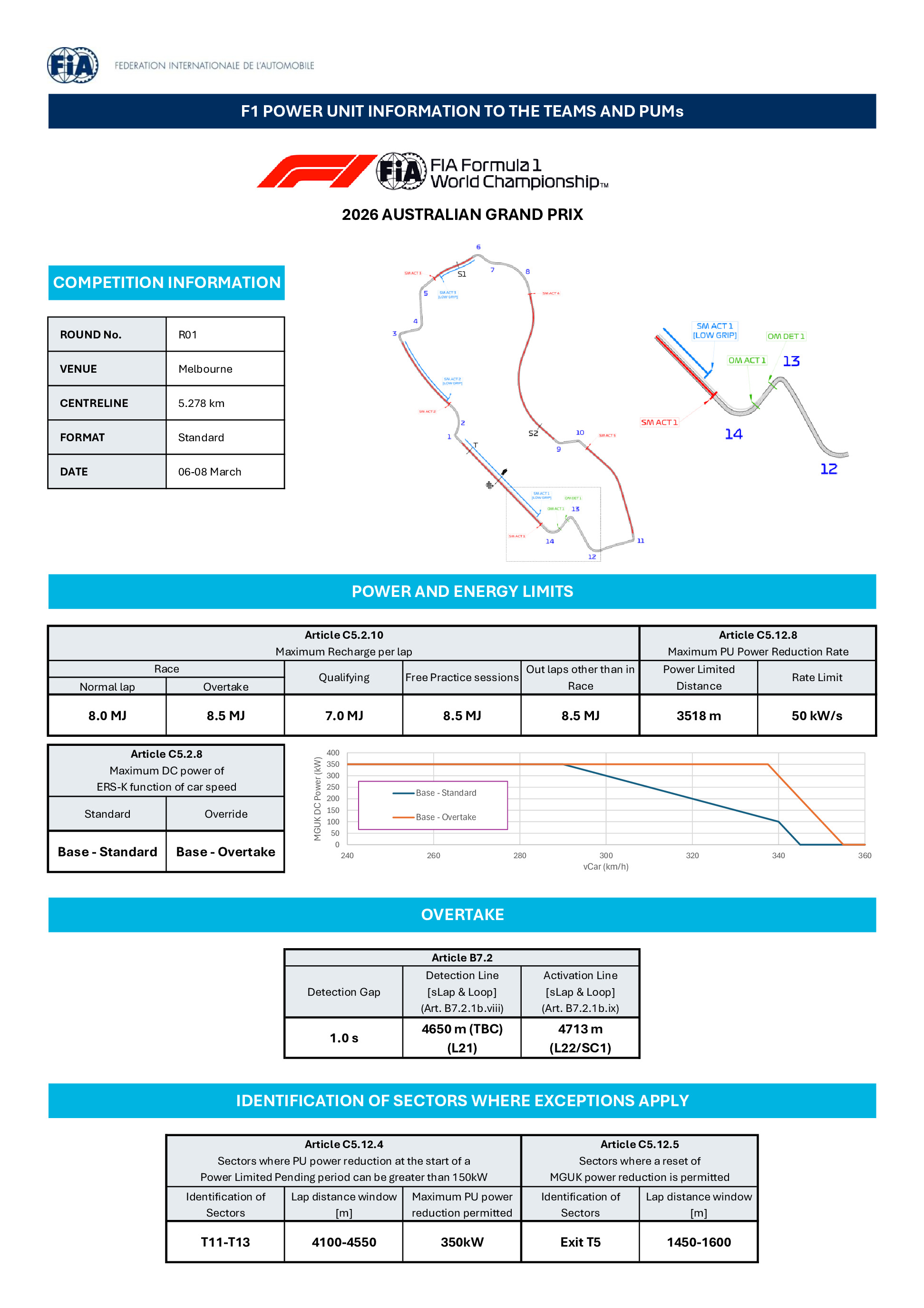 Le circuit comprend également un point de détection ("Overtake Detection") situé juste après l'avant-dernier virage, et un point d'activation ("Overtake Activation") avant le dernier virage. Cette fonction concerne le mode moteur de dépassement, qui permet au pilote de libérer jusqu'à 0,5 MJ d'énergie supplémentaire afin de maintenir la puissance maximale pendant une durée légèrement plus longue.