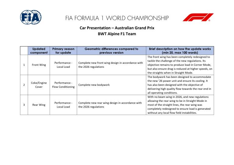 Retour aux Brefs F1Alpine introduit trois évolutions majeures sur l'A526 pour la manche d'ouverture de la saison 2026 à Melbourne. Les modifications concernent l'aileron avant, la carrosserie autour du moteur et l'aileron arrière, l'ensemble ayant été développé spécifiquement pour répondre aux contraintes techniques introduites par le nouveau règlement.