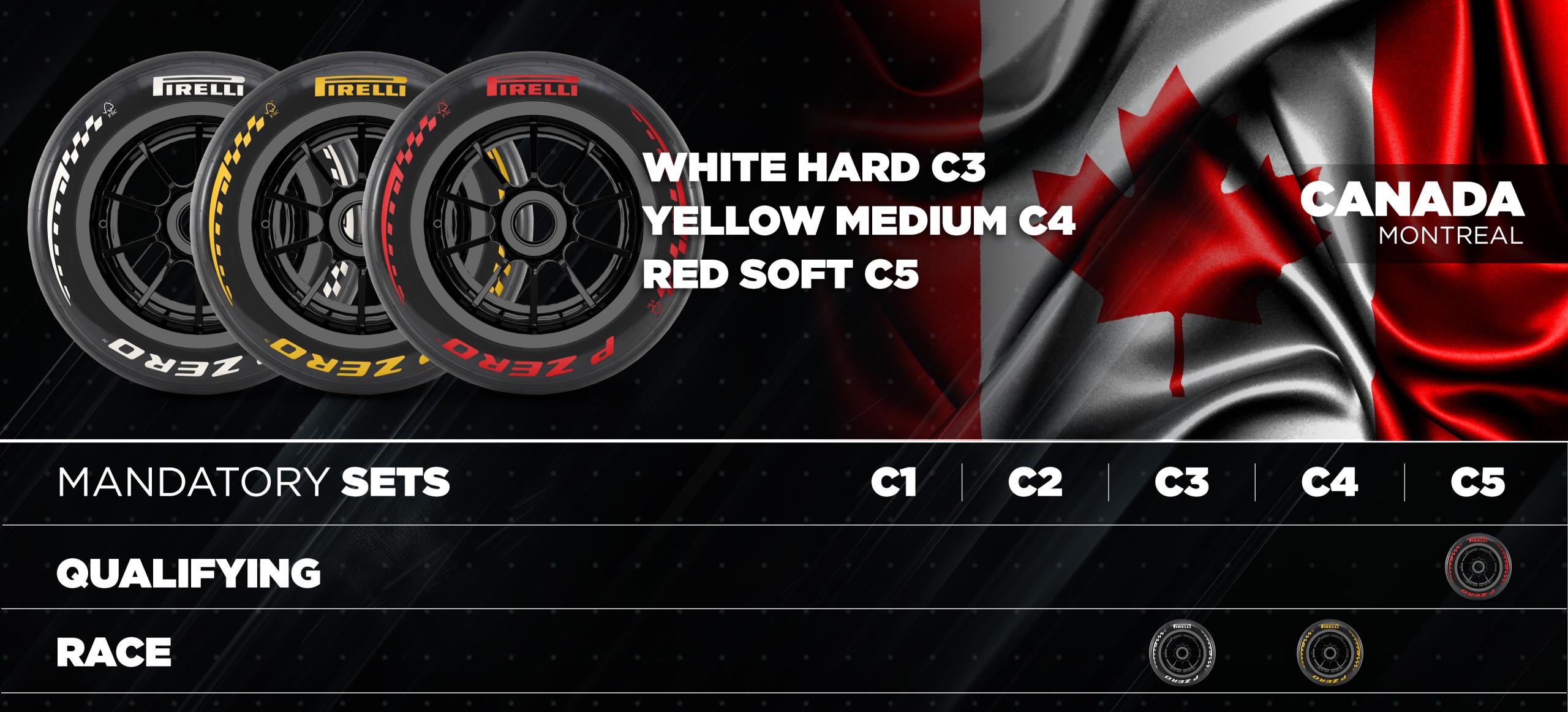 À Montréal, du 22 au 24 mai, le choix du même trio s'explique différemment. Le tracé du circuit Gilles-Villeneuve présente un asphalte peu abrasif, mais impose de fortes contraintes au freinage, nécessitant un niveau de grip élevé. L'an dernier, une gamme encore plus tendre allant jusqu'au C6 avait été retenue, sans que le composé le plus tendre ne s'impose réellement en course. Les stratégies s'étaient alors structurées autour de deux arrêts, en privilégiant les pneus durs et mediums. Par rapport à Miami, l'inconnue principale reste la météo, souvent instable à cette période de l'année au Canada, ce qui peut redistribuer complètement les cartes en matière de stratégie.