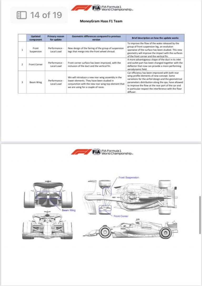 - Haas : suspension avant, écopes de freins avant et beam wing.