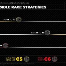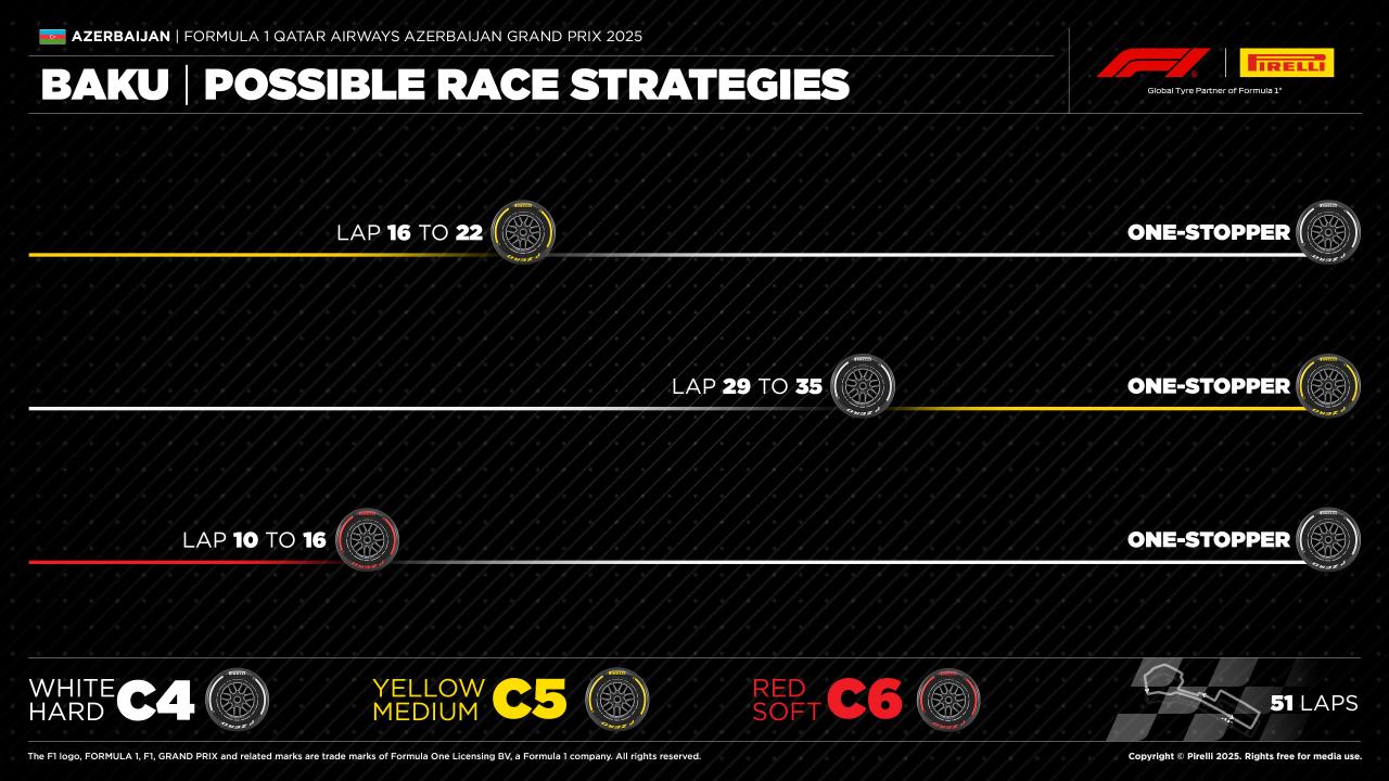 Si la course devait se dérouler sans incident, la configuration à un arrêt devrait s'imposer. Toutefois, la nature même de Bakou incite à la prudence. Les neutralisations sont fréquentes et peuvent rebattre les cartes. Dans ce contexte, une stratégie à deux arrêts peut devenir attractive, en particulier pour un pilote bloqué dans le trafic. Le scénario le plus cohérent dans ce cas reste medium>dur>dur, avec des fenêtres situées entre les 10e et 16e tours puis entre les 28e et 34e tours. Mais le spectre des drapeaux rouges, des Safety Cars ou des Virtual Safety Cars multiplie les variantes possibles et impose une adaptabilité constante.