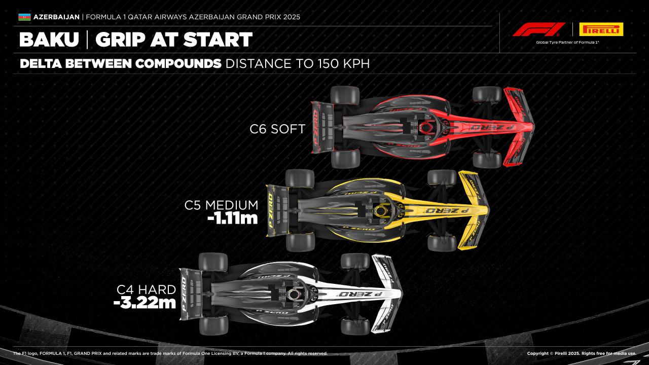 La question de l'utilisation du tendre C6, en théorie peu réaliste sur un tracé exigeant comme Bakou, n'est pas totalement exclue. Les longs relais observés en essais libres ont montré un comportement relativement stable. Un pari tendre>dur nécessiterait d'étirer le relais initial jusqu'au 10e tour minimum, avant de chausser le C4 pour un très long relais jusqu'à l'arrivée. Comme le souligne Mario Isola, directeur de Pirelli Motorsport : "Peut-être que certains tenteront d'utiliser les tendres, car ils se sont montrés performants dans des conditions froides lors des essais. Je m'attends à une forte évolution de la piste, donc c'est une possibilité."
