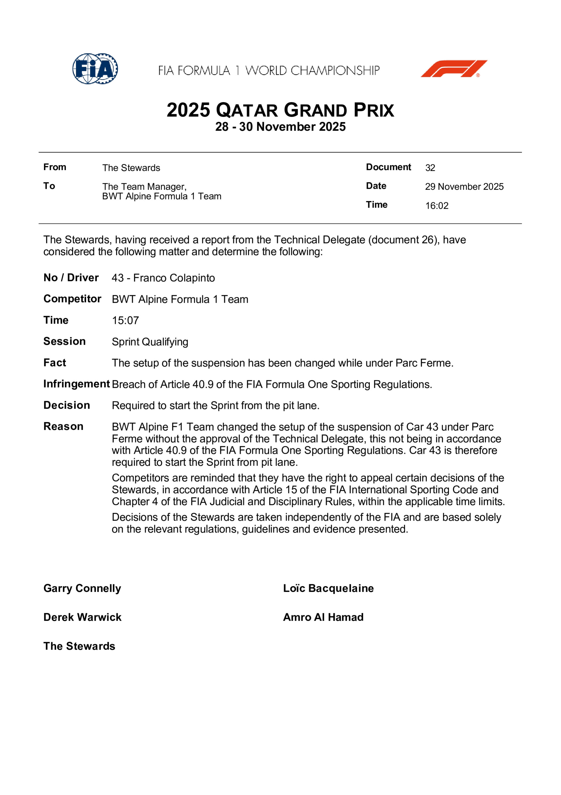 Les pilotes pour cette saison sont Pierre Gasly et Franco Colapinto, portant respectivement les numéros 10 et 43.