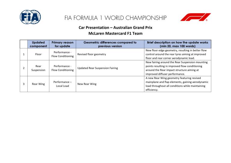 McLaren introduit trois évolutions sur la MCL40 pour l'ouverture de la saison au Grand Prix d'Australie. L'équipe de Woking concentre ses modifications sur l'arrière de la monoplace avec un nouveau plancher, une évolution des carénages de suspension arrière et un aileron arrière revu.