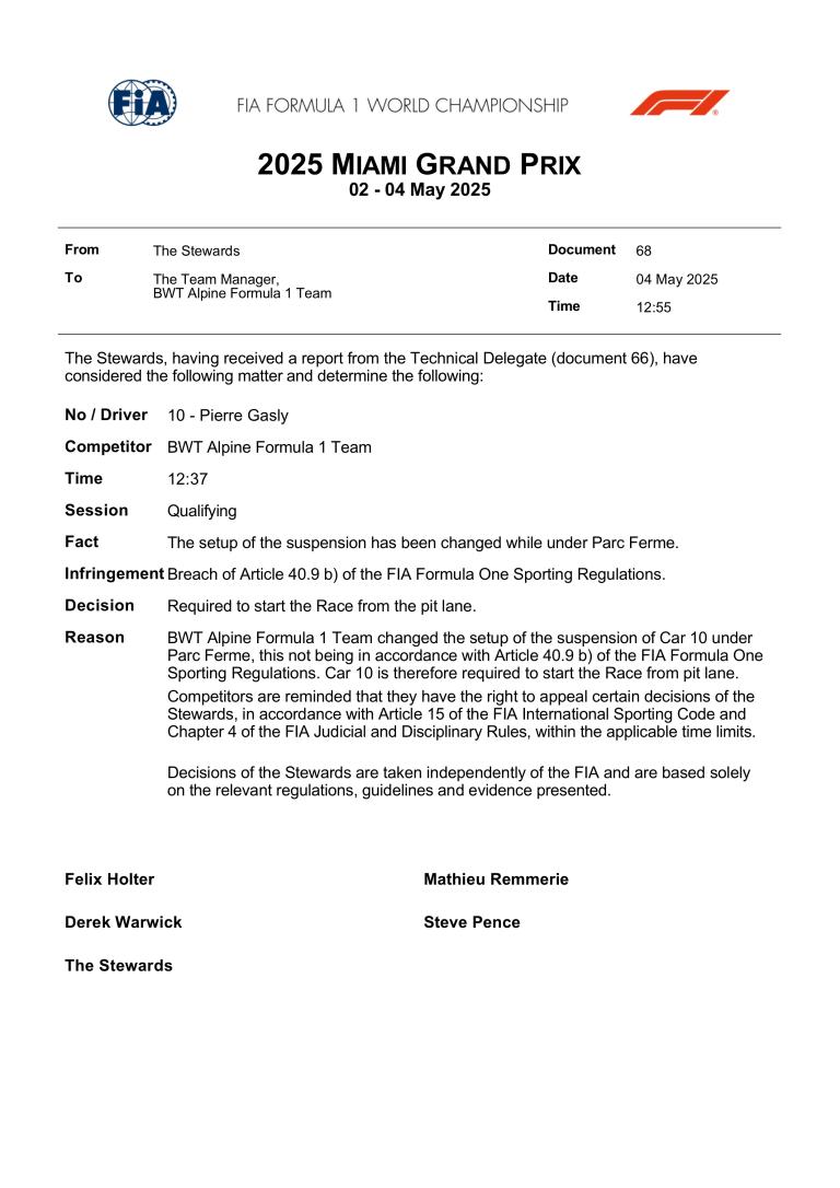 Avec Liam Lawson, Pierre Gasly a aussi droit d'être sanctionné par les commissaires pour non-respect du règlement technique et sportif en vigueur. Le pilote Alpine devra lui aussi s'élancer depuis la voie des stands à Montréal.