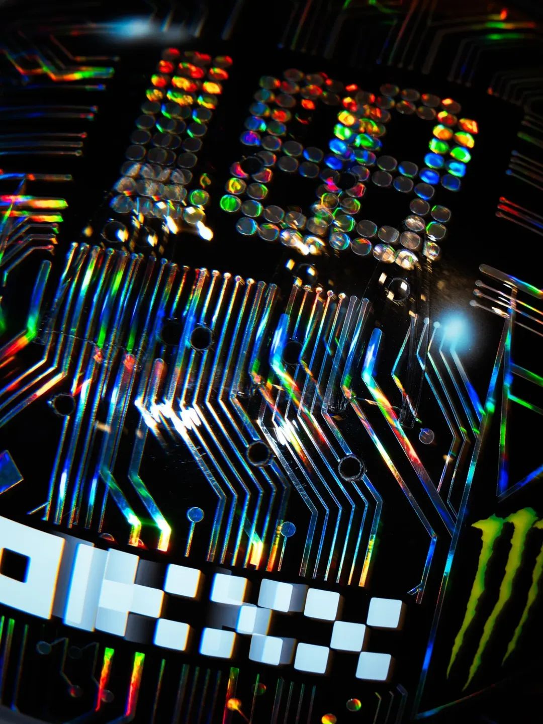 Oscar Piastri présente à Austin un casque au style singulier, inspiré des circuits électroniques. Sur une base noire holographique, les motifs évoquent des pistes imprimées de carte mère, clin d'œil à la technologie et au partenariat entre McLaren et Google Gemini. Un design rétro-futuriste signé MDM Designs, mêlant esthétique numérique et précision technique.