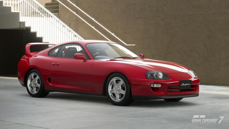 La première est la Toyota Supra RZ '97, habillée de son célèbre rouge Super Red IV. Propulsée par le fameux six cylindres en ligne 3.0 litres 2JZ-GTE à double turbo, elle reste l'un des modèles les plus vénérés des amateurs de performance. Dans Gran Turismo, elle incarne parfaitement l'équilibre entre puissance, souplesse et propulsion brute, le tout soutenu par une bande-son mécanique reconnaissable entre mille.