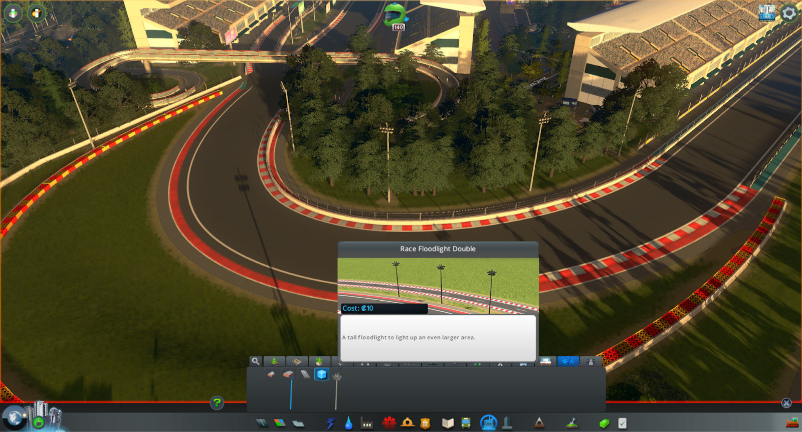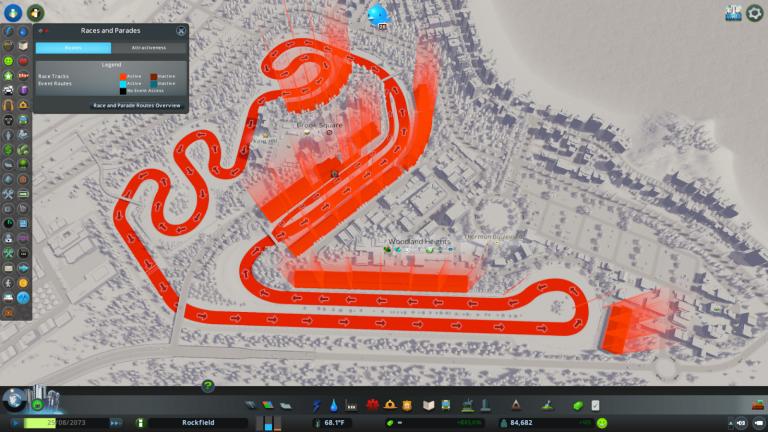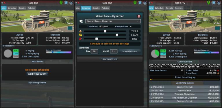 Les tribunes, déclinées en plusieurs tailles, influencent directement l'attractivité de l'événement et le nombre de spectateurs. Une nouvelle vue d'information dédiée aux courses et parades permet de visualiser les tracés validés, leur sens de circulation ainsi que leur attractivité. Les joueurs peuvent également planifier leurs compétitions en choisissant la catégorie (Hyper Car, Formula ou Circuit Cruisers), le nombre de tours, le niveau de l'épreuve et le prix des billets, avec un impact direct sur les coûts et l'affluence.