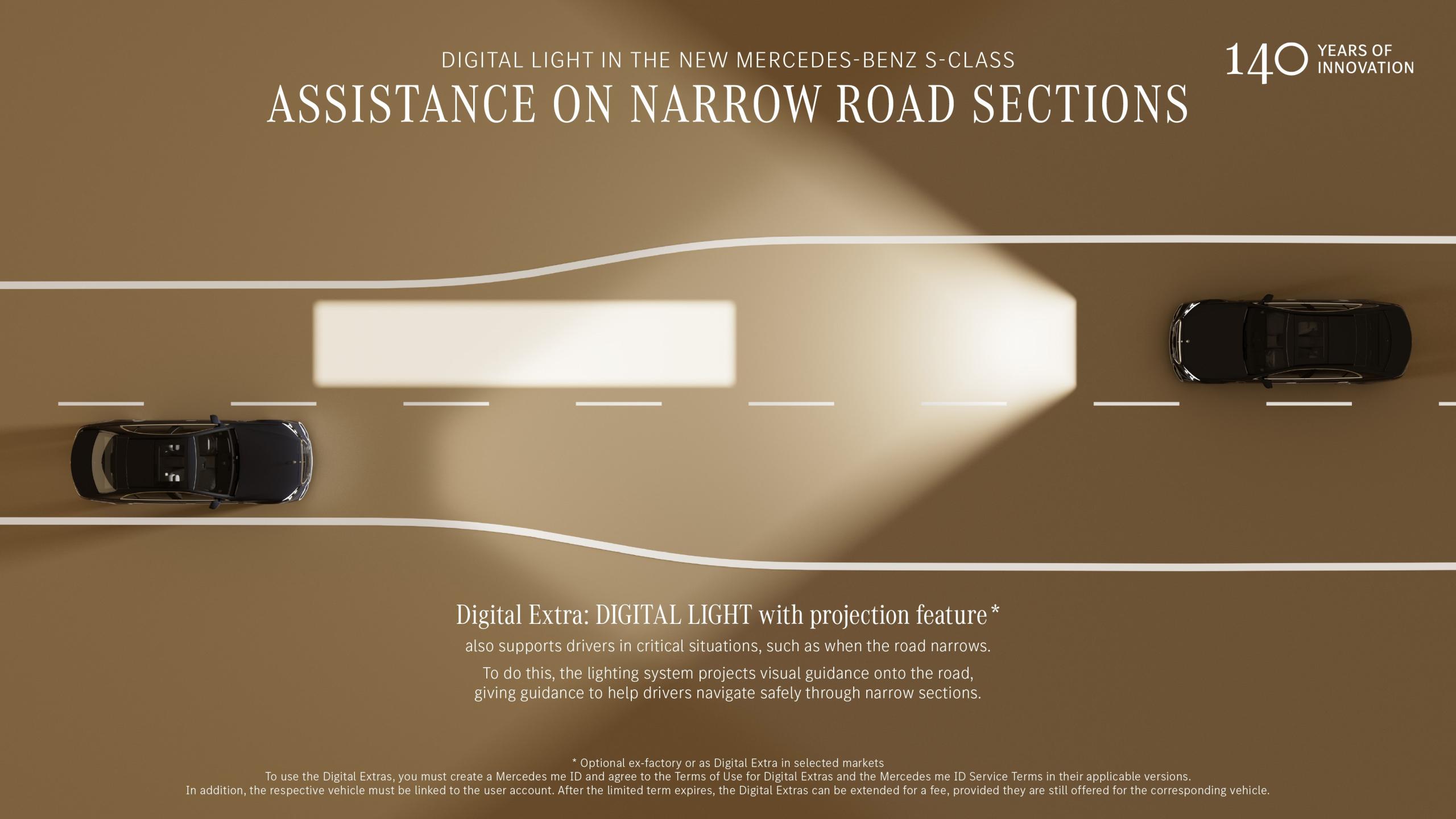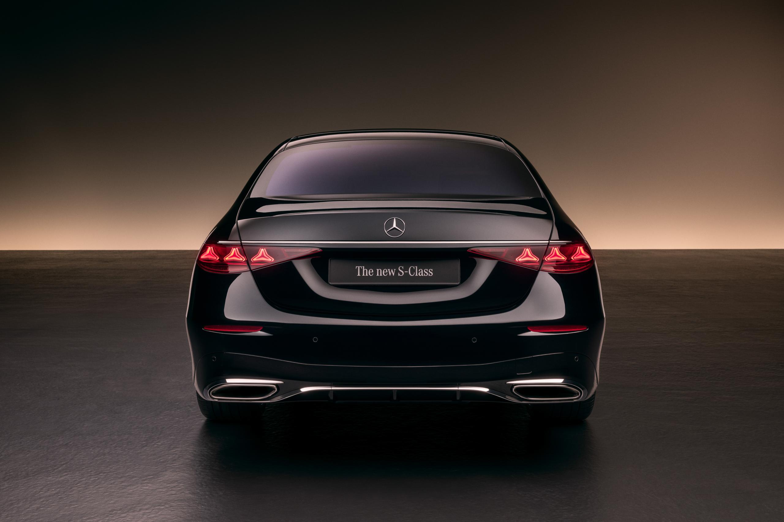 Visuellement, la Classe S adopte une signature plus affirmée. La calandre gagne en largeur et peut désormais être éclairée, tout comme l'étoile dressée sur le capot, proposée pour la première fois en version lumineuse. Les nouveaux projecteurs DIGITAL LIGHT à technologie micro-LED offrent une portée accrue et une meilleure définition du faisceau, tandis que les feux arrière adoptent un graphisme à trois étoiles. L'éclairage devient un élément central de l'identité du modèle, avec également un projecteur latéral diffusant le nom Mercedes-Benz au sol à l'ouverture des portes.
