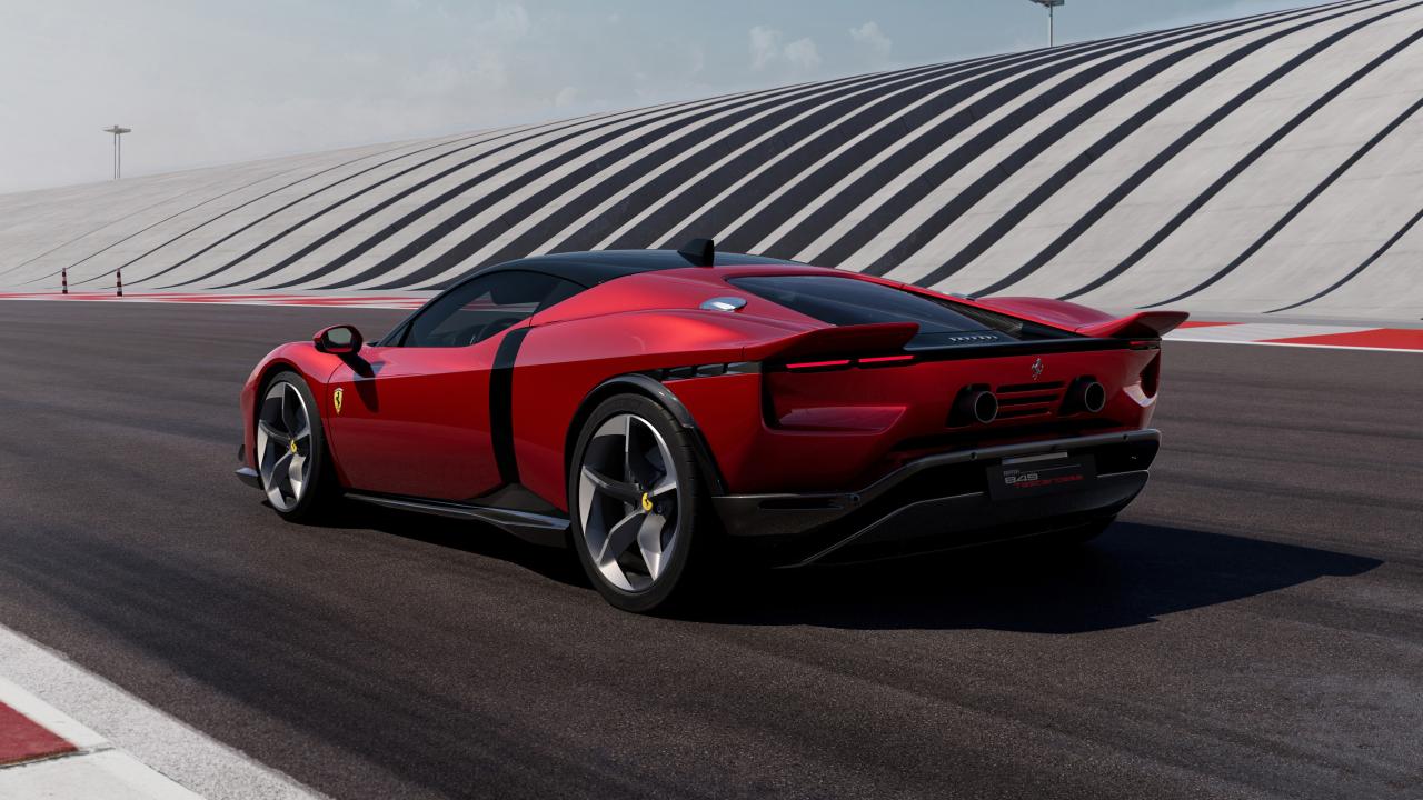La Ferrari 849 Testarossa, présentée en 2025, succède à la SF90 Stradale. Berlinette hybride rechargeable, elle associe un V8 3 990 cm³ biturbo de 830 ch et 842 Nm à trois moteurs électriques pour une puissance cumulée de 1 050 ch. Elle revendique plus de 330 km/h, 0 à 100 km/h en moins de 2,3 s et 0 à 200 km/h en 6,35 s. Son poids à sec de 1 570 kg (45/55) et son aérodynamique active assurent 415 kg d’appui à 250 km/h. Première Ferrari équipée du système FIVE et de l’ABS Evo, elle offre des freinages plus courts et un comportement plus précis.