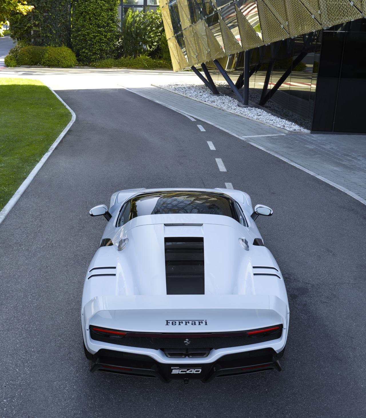 Berlinette unique issue du programme Projets Spéciaux, la Ferrari SC40 rend hommage à la F40. Basée sur la 296 GTB, elle associe un V6 biturbo hybride de 830 ch à un design exclusif signé Flavio Manzoni, avec aileron fixe, structure carbone-Kevlar et teinte « SC40 White ».