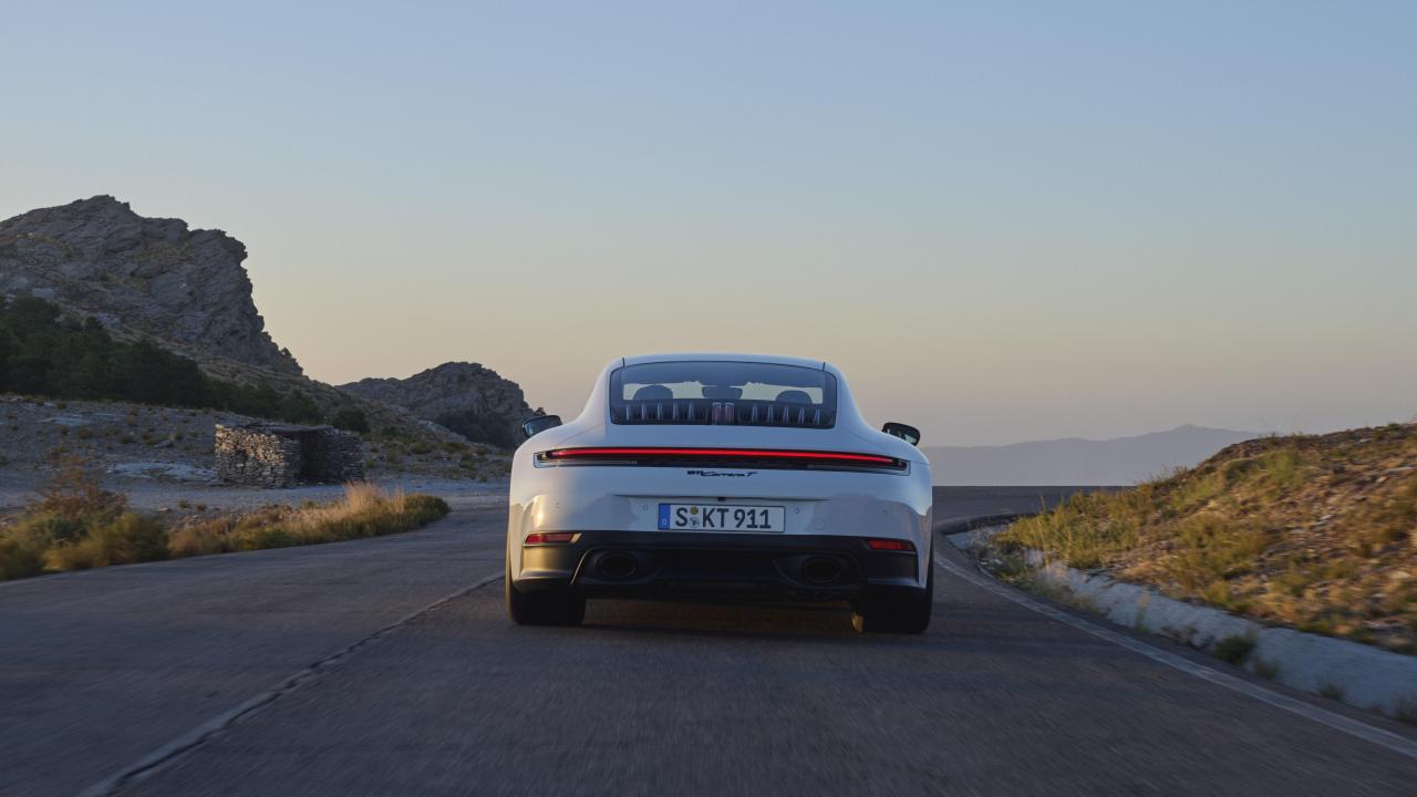 La Porsche 911 Carrera T est animée par un flat-six biturbo de 3,0 L développant 394 ch et 450 Nm. Elle atteint les 100 km/h en 4,5 s et une vitesse de pointe de 295 km/h, grâce à une boîte manuelle à six rapports et un allègement massif. Conçue pour les puristes, cette 911 T est équipée de roues arrière directrices et d’une suspension sport abaissée, offrant une agilité optimale. Avec sa sonorité captivante, son design dépouillé et sa transmission intégrale, elle incarne l’esprit de la 911 pour les passionnés de conduite authentique.