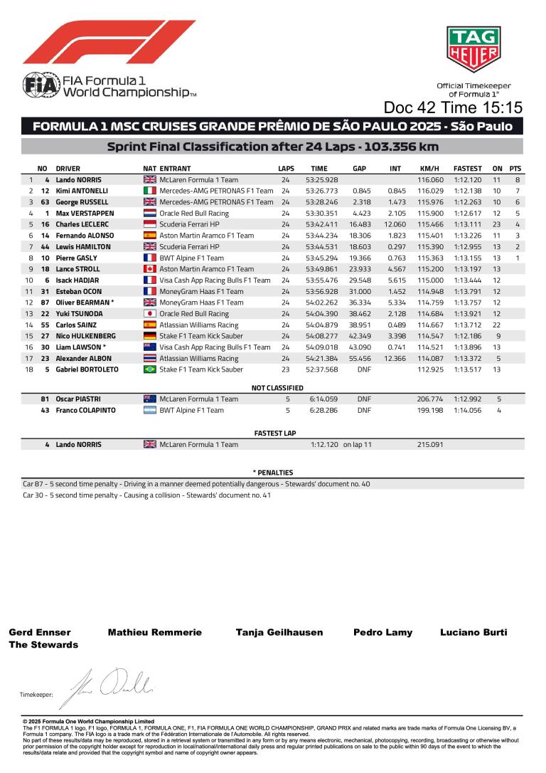 Le drapeau à damier tombe donc sur une victoire méritée mais difficile pour Norris, qui a dû composer avec des pneus dégradés, des rafales de vent et la pression constante d'Antonelli. Le Britannique résumait parfaitement la tension de ce Sprint : "C'était difficile. Cela rend la victoire d'autant plus gratifiante après une course comme celle-là, surtout avec Kimi derrière – il ne m'a clairement pas facilité la tâche. C'est le genre de course où il faut attaquer sans relâche, parce que vous savez que celui derrière poussera encore un peu plus. C'était limite par moments, j'ai dû lever légèrement deux fois, mais avec le vent et la dégradation des pneus, c'était compliqué. Définitivement pas une course facile, mais probablement le type de course auquel on s'attend ici, au Brésil : toujours difficile."