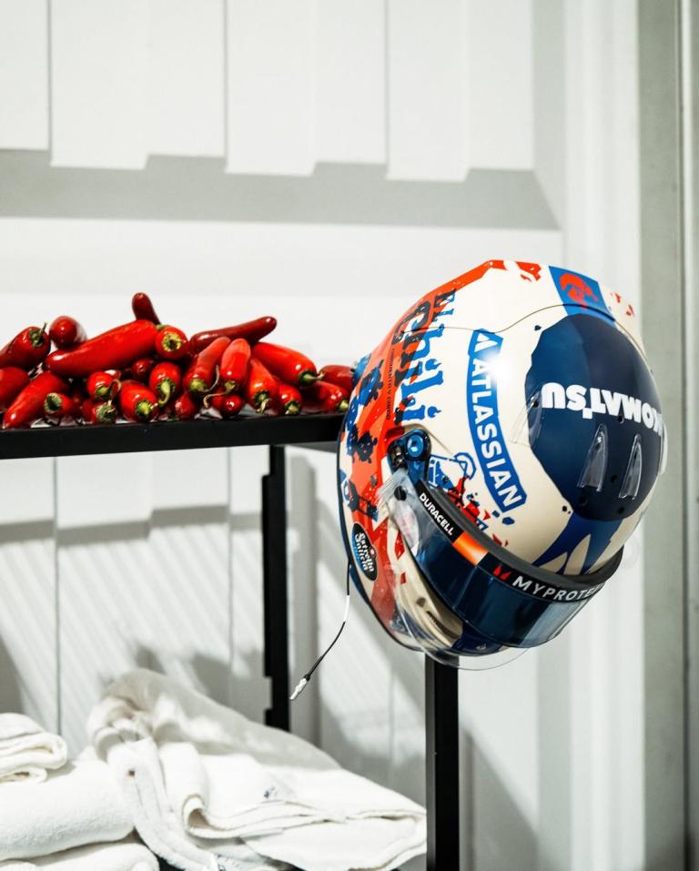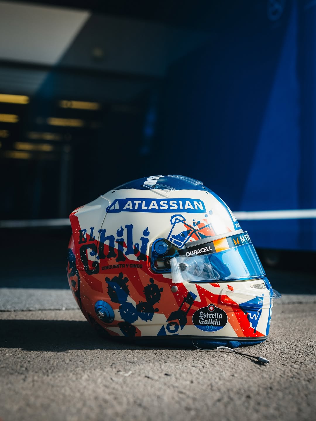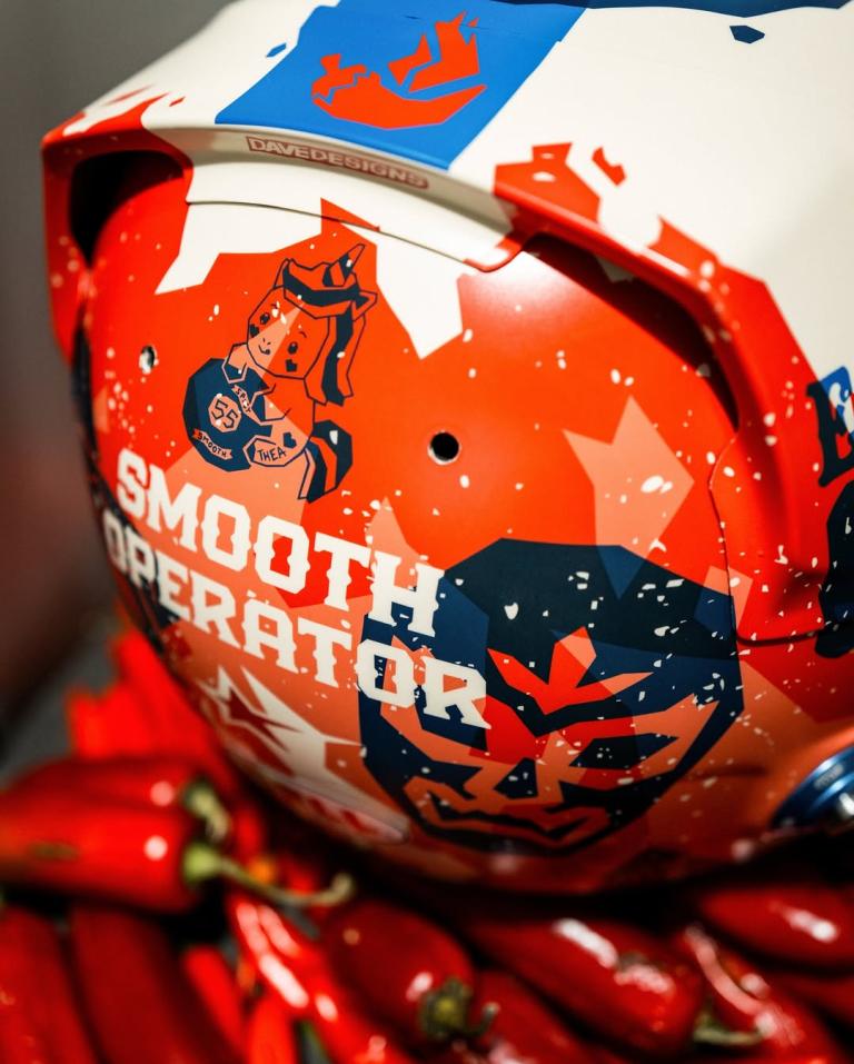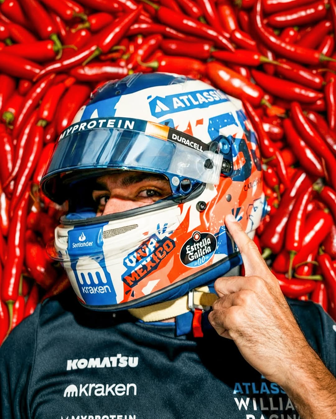 Pour le Grand Prix du Mexique 2025, Carlos Sainz a dévoilé un casque inédit signé Dave Designs, dominé par le rouge des piments, du bleu profond et une base crème. Inspiré par l'ambiance brûlante de Mexico, il rend hommage à la ferveur locale avec une thématique "chili pepper" parfaitement assumée.