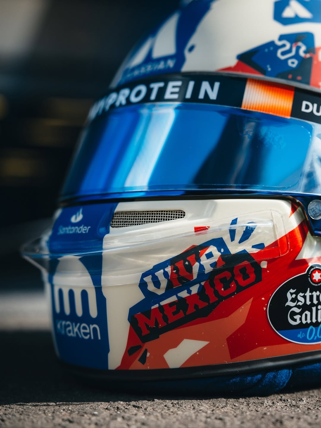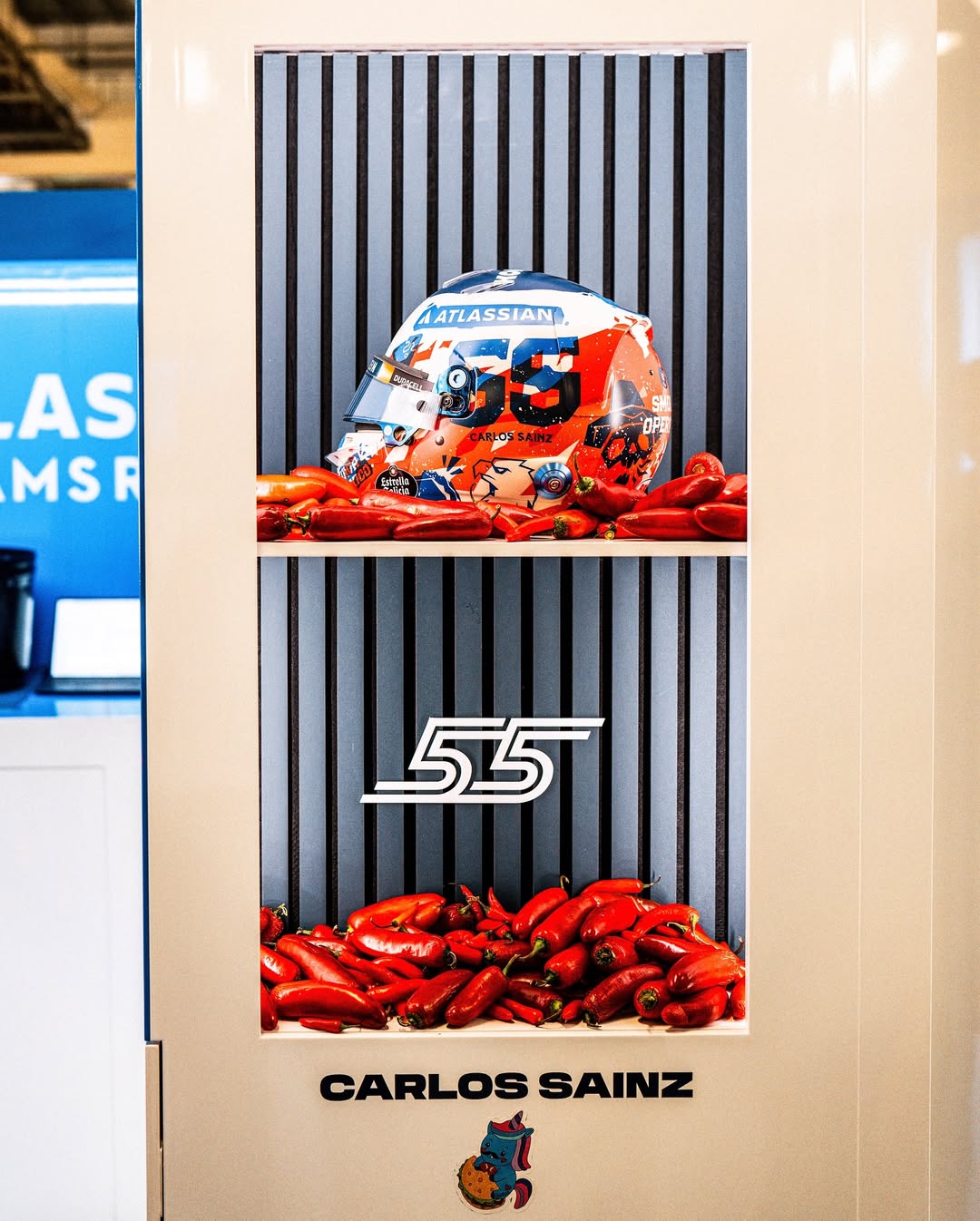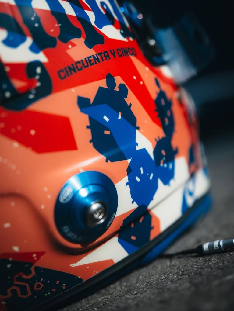 Le casque affiche le numéro 55, la mention "Smooth Operator" et plusieurs clins d'œil à la culture mexicaine. Mais les fans attentifs auront aussi repéré le retour de la licorne dessinée par Thea, une jeune fan britannique. Déjà apparue sur le casque de Bakou, la petite licorne "Sparkles ou Sprinkles" symbolise la promesse tenue de Sainz à cette enfant, et semble depuis être devenue son porte-bonheur.