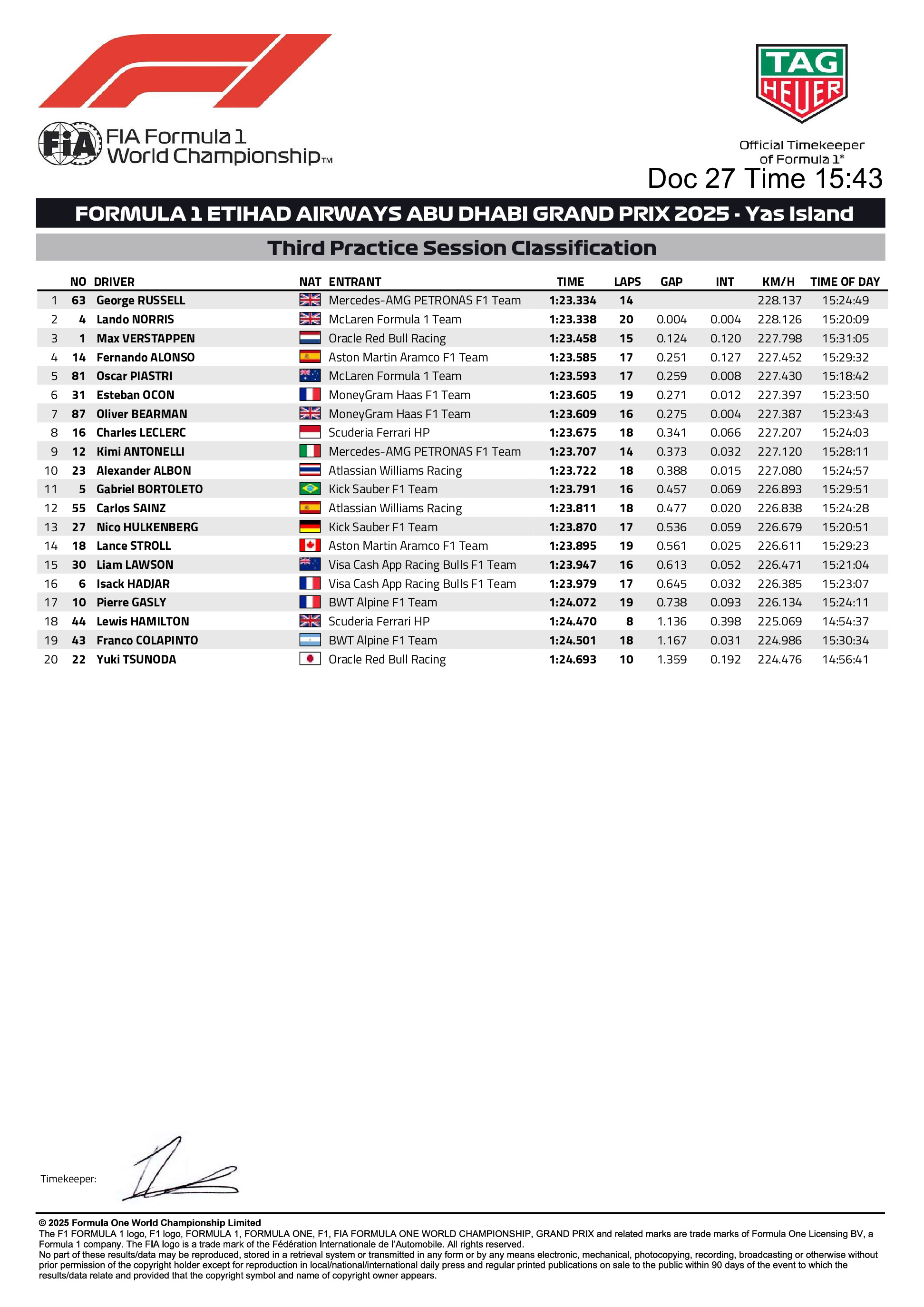 George Russell a pris l'avantage sur Lando Norris dans les toutes dernières minutes de la troisième séance d'essais libres à Abou Dabi, signant un 1:23.334 en pneus tendres. Le pilote Mercedes devance Norris de seulement 0.004 s et Max Verstappen de 0.124 s, au terme d'une séance dense et particulièrement serrée, où la moitié du plateau se tient en moins de quatre dixièmes.