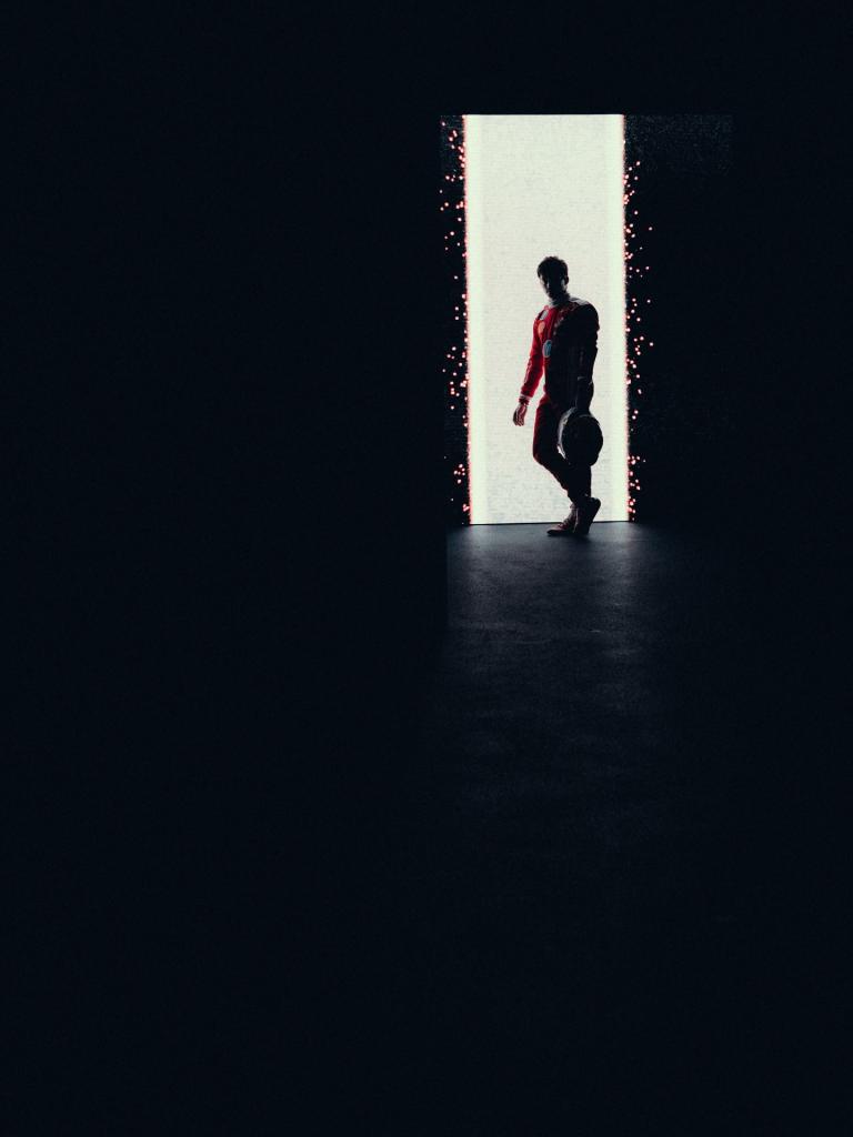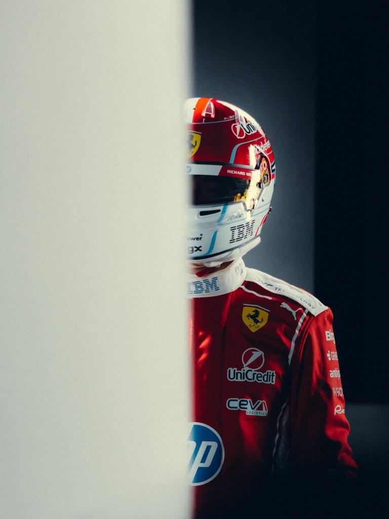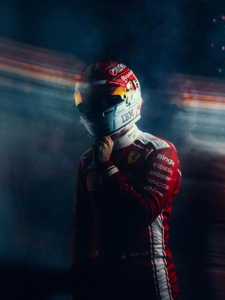 Charles Leclerc, dans sa nouvelle combinaison Ferrari, a présenté son casque cru 2026, qui a "un peu plus de bleu clair".