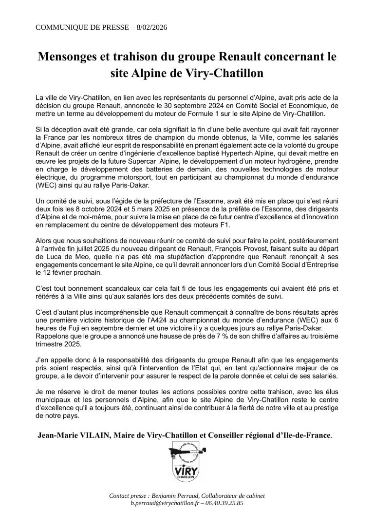 Retour aux Brefs F1Le maire de Viry-Chatillon, Jean-Marie Vilain, a publié le 8 février 2026 un communiqué particulièrement sévère à l'encontre du groupe Renault, qu'il accuse de revenir sur ses engagements concernant l'avenir du site Alpine de la commune. Pour mémoire, le 30 septembre 2024, Renault avait annoncé en Comité social et économique la fin du développement du moteur de Formule 1 à Viry-Chatillon, actant ainsi la fermeture d'un chapitre majeur de l'histoire du sport automobile français sur ce site.