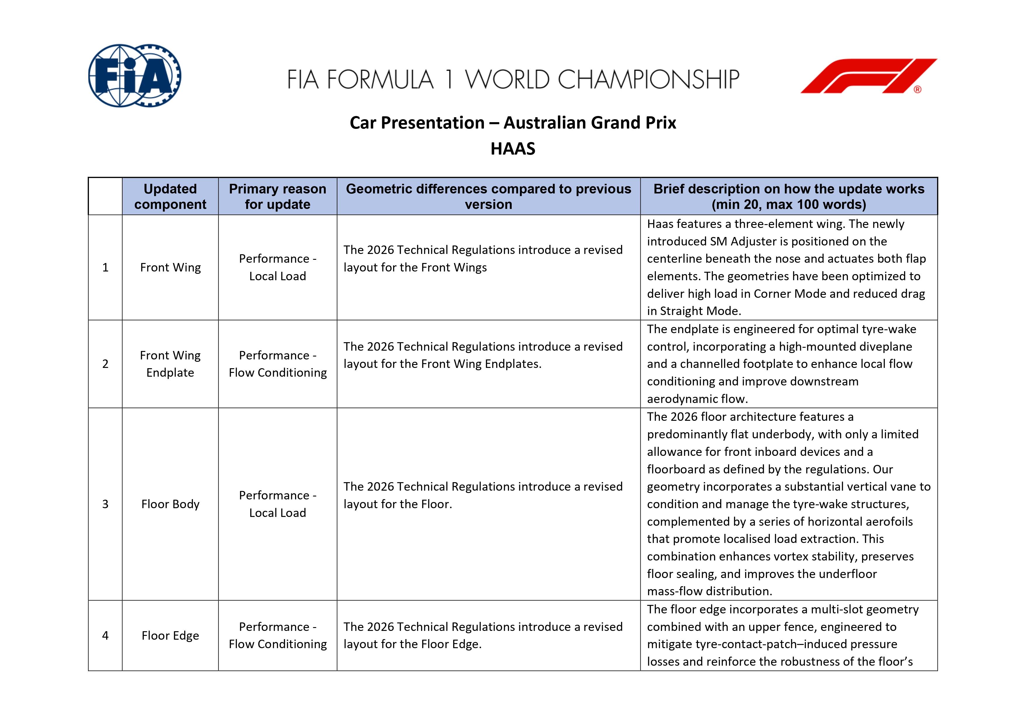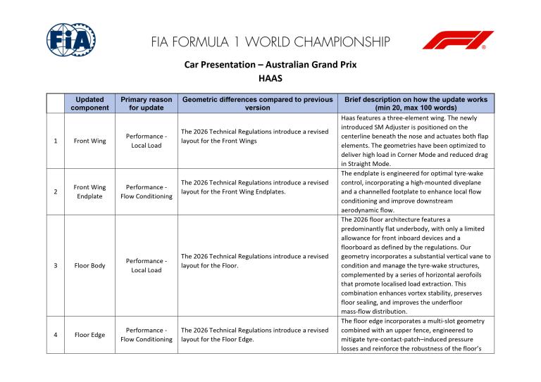 Haas introduit une série d'évolutions importantes sur la VF-26 pour l'ouverture de la saison 2026 à Melbourne. Les modifications concernent l'aileron avant, les plaques d'extrémité de cet aileron, le plancher, le bord de plancher, le diffuseur, l'aileron arrière ainsi que l'aileron de poutre (beam wing). L'ensemble de ces éléments a été développé pour s'inscrire dans la nouvelle architecture aérodynamique imposée par le règlement 2026 tout en maximisant la génération d'appui sous la monoplace.
