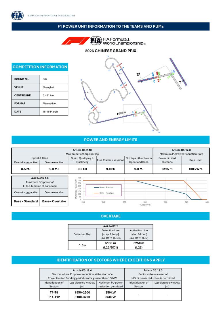 Le règlement énergétique associé aux nouvelles unités de puissance est également encadré de manière précise. Selon l'article C5.2.10 du règlement technique, la recharge maximale autorisée par tour atteint 8,5 MJ en course lorsque le mode dépassement n'est pas actif, et peut monter à 9,0 MJ lorsque celui-ci est activé. Pour les qualifications Sprint, les qualifications classiques et les séances d'essais libres, la limite est également fixée à 9,0 MJ par tour, tout comme lors des tours de sortie.