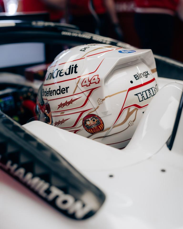 À Suzuka, Lewis Hamilton arbore un casque spécial japonais, à base blanche plutôt que jaune.