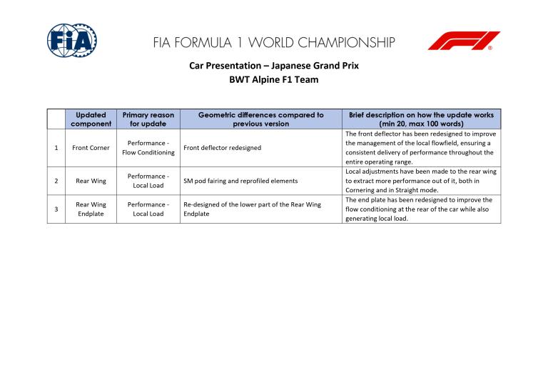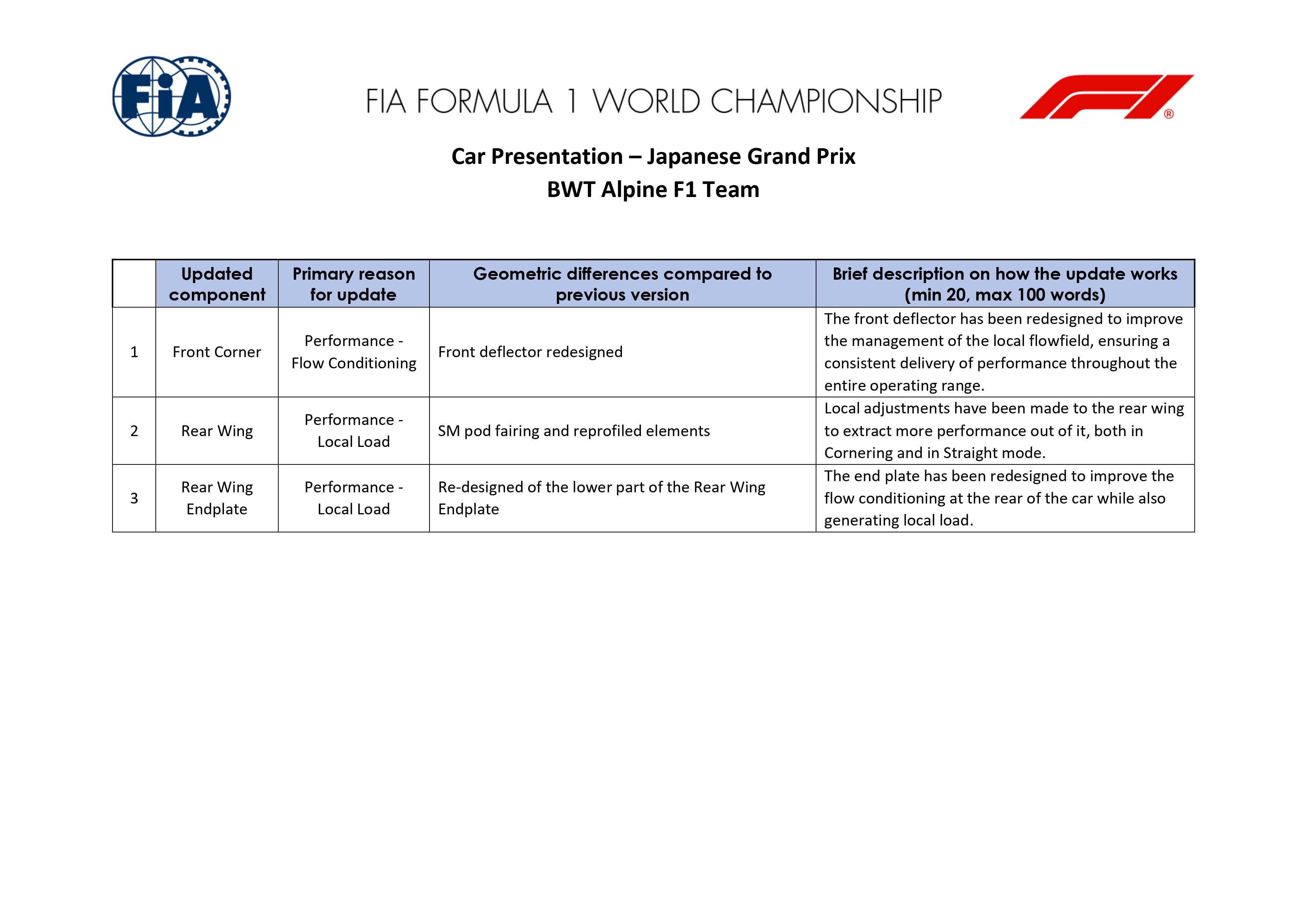 Retour aux Brefs F1Pour Suzuka, Alpine introduit trois évolutions sur l'A526, avec une première modification à l'avant de la voiture et deux autres concentrées autour de l'aileron arrière.