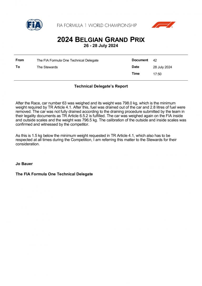"Après la course, la voiture numéro 63 [Russell] a été pesée et son poids était de 798,0 kg, ce qui est le poids minimum requis par l'article 4.1 du Règlement Technique."