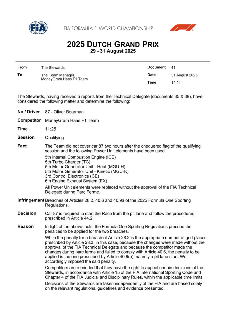 Oliver Bearman devait initialement s'élancer depuis la 19e place sur la grille à Zandvoort, mais la situation a empiré pour le jeune pilote Haas à l'issue des vérifications techniques post-qualifications. Les commissaires ont confirmé qu'une série d'éléments de l'unité de puissance avait été changée sans l'autorisation du délégué technique de la FIA, et alors que la voiture se trouvait déjà sous régime de parc fermé. Ont ainsi été remplacés le ci...