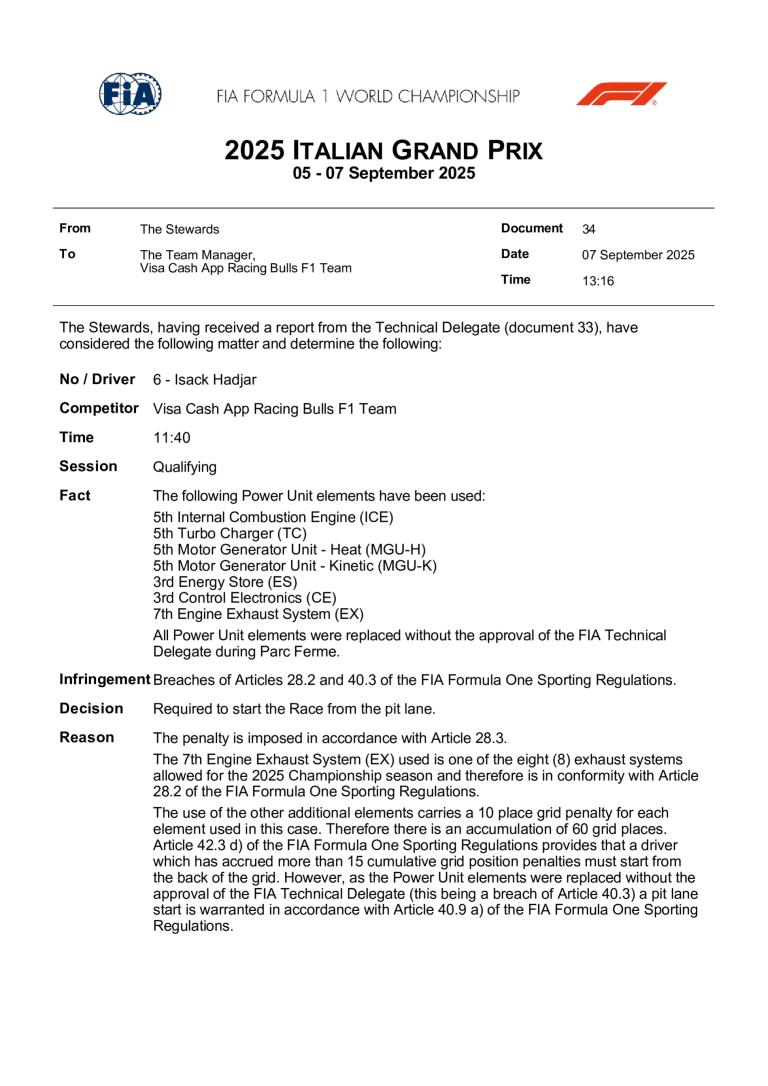Les commissaires du Grand Prix d'Italie ont infligé une sanction identique à Isack Hadjar. Sur la voiture n°6 du team Visa Cash App Racing Bulls, de nombreux éléments de l'unité de puissance ont été remplacés en parc fermé sans validation de la FIA : cinquième moteur à combustion interne, cinquième turbocompresseur, cinquième MGU-H, cinquième MGU-K, troisième batterie, troisième électronique de contrôle et septième échappement.