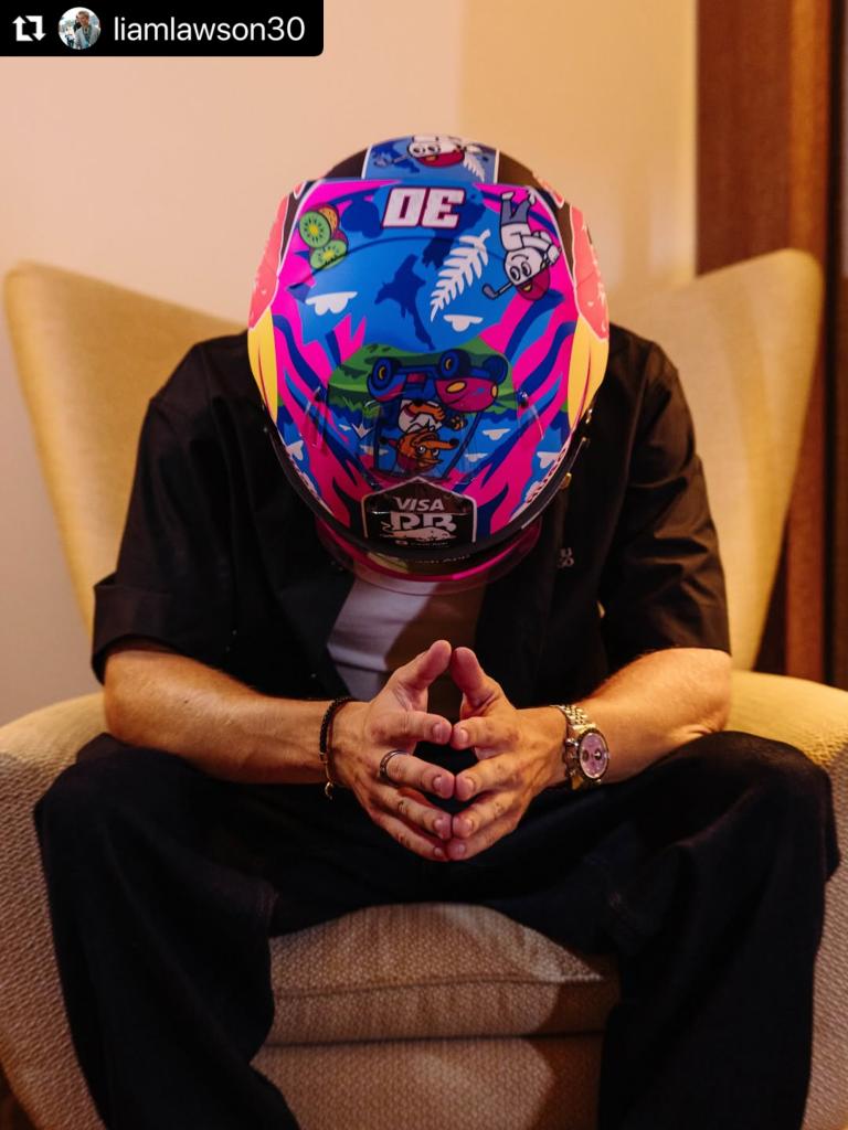 Casque spécial #MiamiGP pour Liam Lawson qui pilotera une Racing Bulls avec livrée rose fluo.