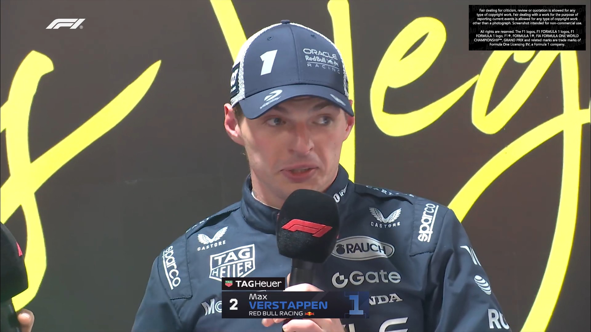 Max Verstappen au micro de Sky Sports après sa qualification Sprint au GP de Belgique : "Être P2 entre les deux McLaren, c'est déjà un bon résultat pour nous. Je pense qu'on a tiré le maximum."