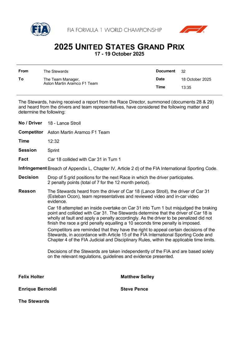 Les commissaires du Grand Prix des États-Unis ont infligé une pénalité à Lance Stroll pour sa responsabilité dans la collision avec Esteban Ocon lors du Sprint. L'incident, survenu au virage 1, avait entraîné l'abandon des deux pilotes et provoqué la deuxième intervention de la voiture de sécurité.