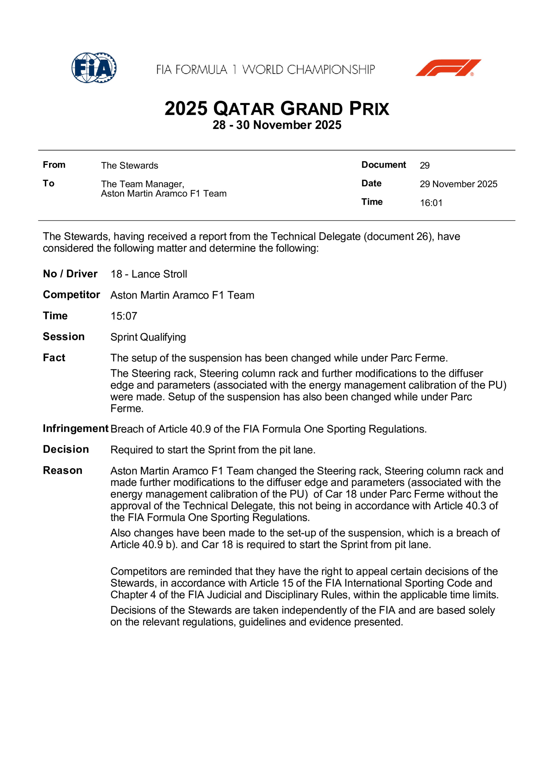 Lance Stroll s'élancera depuis la voie des stands pour le Sprint de Losail, la FIA ayant confirmé que l'Aston Martin n°18 n'était plus conforme au régime du parc fermé. L'équipe a remplacé la crémaillère de direction et la colonne, tout en modifiant la zone du diffuseur ainsi que certains paramètres liés à la gestion énergétique du groupe propulseur, sans autorisation du délégué technique, en violation de l'article 40.3 du règlement sportif.