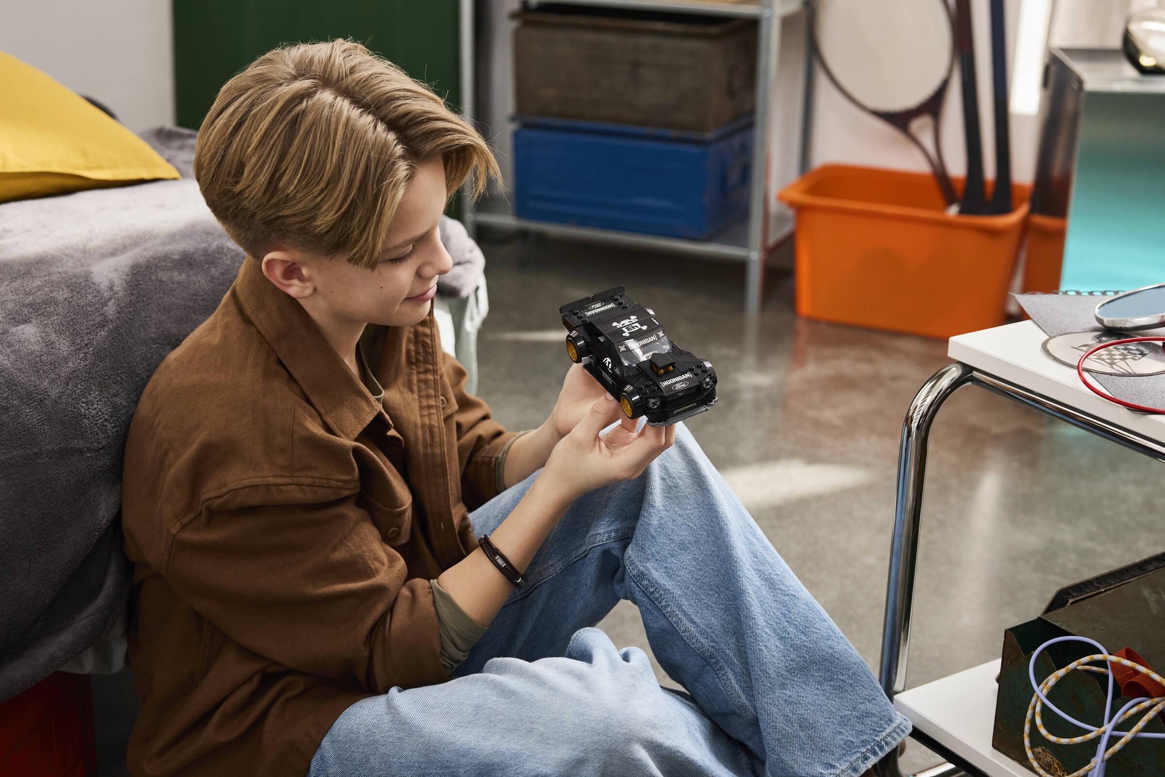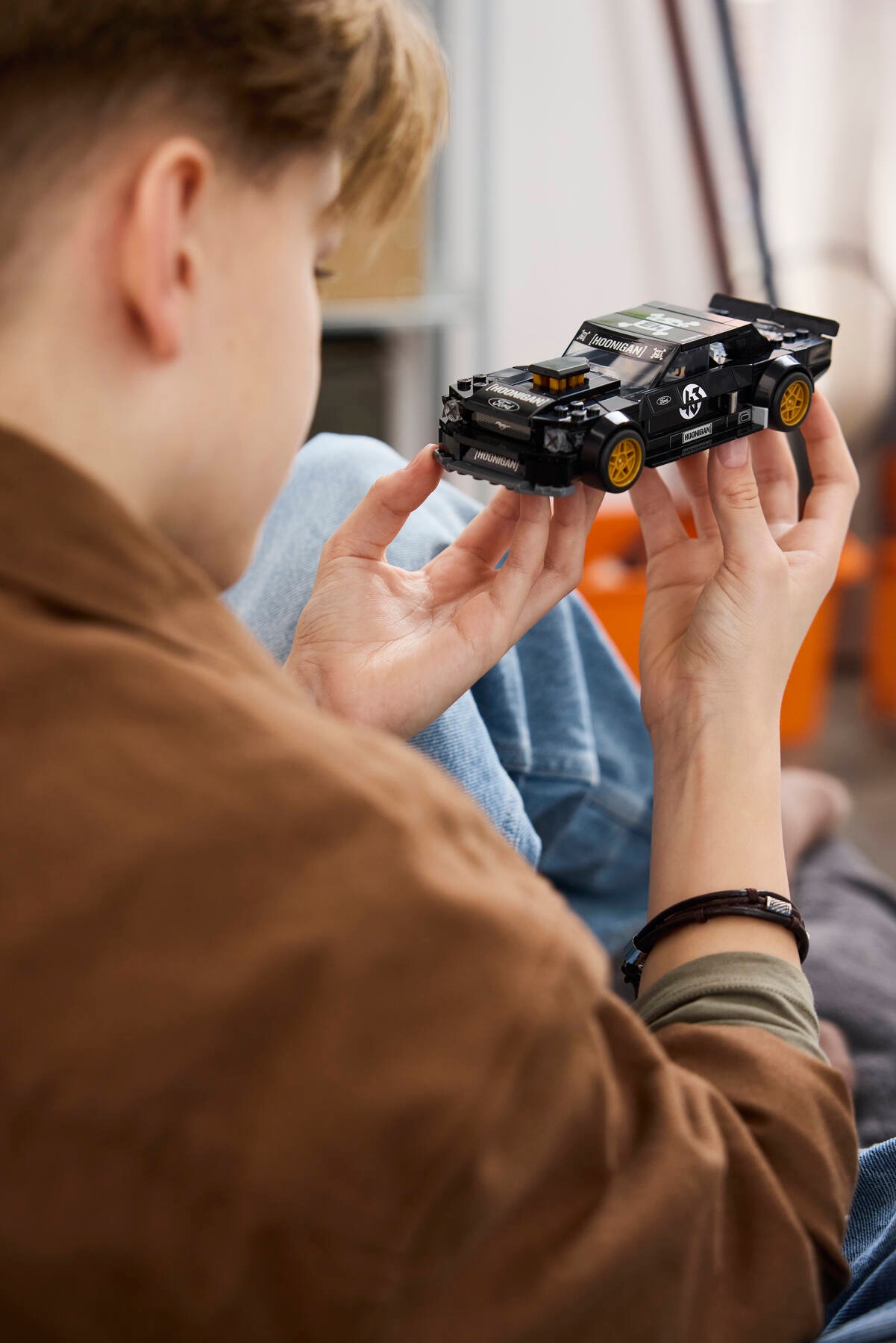 La miniature reprend plusieurs éléments caractéristiques de cette première Hoonicorn, avec sa silhouette de Mustang fastback, son imposante admission sur le capot, ses jantes dorées, son large kit carrosserie et sa livrée noire marquée du célèbre numéro 43. LEGO y ajoute également une minifigurine de feu Ken Block, avec casque et tenue Hoonigan (sans motoneige).